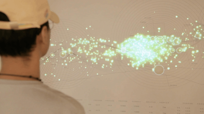 作品说明:《星·墓》是一场独特的艺术展览,将信息化设计和交互技术融合,以唐十八陵为主题,将帝王陵墓比作闪耀的星辰。展览通过数据可视化和交互技术展示人们对这些珍贵历史遗产的关注和影响。观众可以双手操控设备,探索星空中的陵墓和星光。陵墓发散不同数量的星光,根据在网络搜索指数中的排名确定。观众的互动行为将影响星光的运动轨迹和位置。《星·墓》旨在唤起观众对鲜为人知历史文化遗产的关注。通过信息化设计和交互技术的结合,展示人们的主观能动性如何为这些珍贵的历史遗产带来关注和影响。展览希望让观众在艺术与科技的交融中重新发现和认识这些历史的瑰宝及其对文化传承的重要性。