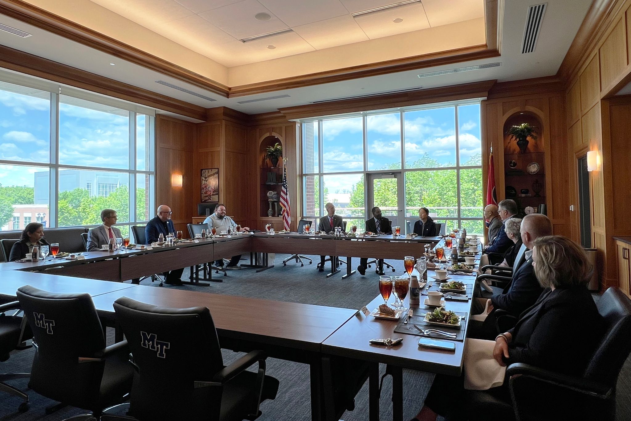 5月1日中午,中田纳西州立大学为代表团举行了欢迎午宴。中田纳西州立大学校长Sidney McPhee,教务长Mark Byrnes,学生事务副校长Debra Sells,学校发展副校长Joe Bales,财务副校长Alan Thomas,市场与传播副校长Andrew Oppmann,国际事务副校长Robert Summers,应用科学学院院长Greg Van Patten,计算机科学系主任Medha Sarkar,亚洲研究中心主任Guanping Zheng教授等出席。午宴上,中田纳西州立大学校方和代表团畅聊交流合作计划,分享彼此的经验和想法,加深彼此了解。