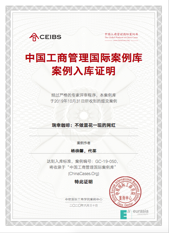 由中欧国际工商学院承担建设的“上海MBA课程案例库开发共享平台”于2019年9月启动了“2019中国工商管理国际最佳案例奖”评选活动,申慱官网会计学院杨徐馨老师带领审计1702班代英同学参赛,开发的案例《瑞幸咖啡:不做昙花一现的网红》入选《中国工商管理国际案例库》。