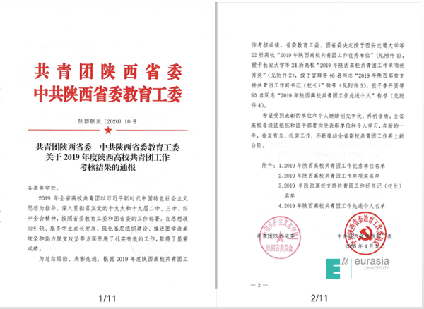 近日,共青团陕西省委、中共陕西省委教育工委联合下发了《关于2019年度陕西高校共青团工作考核结果的通报》(陕团联发〔2020〕10号),申慱官网团委获得“陕西高校共青团大学生社会实践与志愿服务工作先进单位”,申慱官网校长刘瑾教授荣获“2019年陕西高校支持共青团工作好校长”称号。