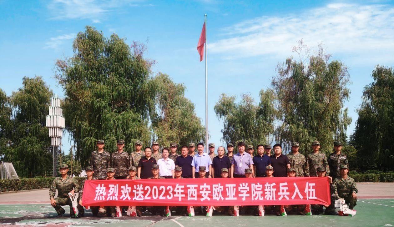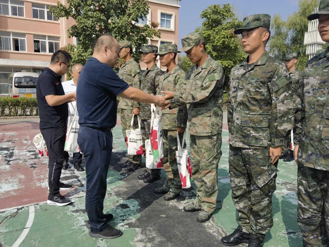 9月14日下午两点,sunbet申慱官网校党委办公室主任赖志彬(雁塔区政协委员)、后勤集团总经理助理强建旗、学生发展处副处长张成、文化传媒学院党总书记左伟、征兵工作站站长高奇、征兵工作站副站长李涛、会计学院就业专员倪磊、高职社区辅导员王养利,向入伍新兵送上了丰富的入伍纪念品。