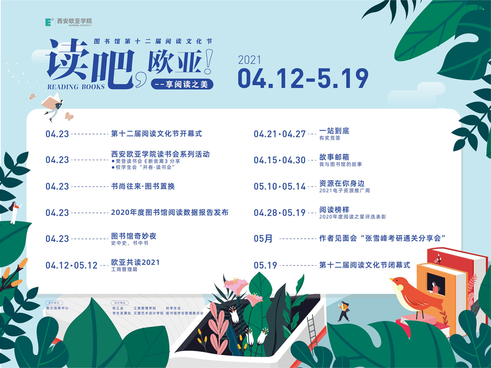 4月23日是第26个世界读书日,申慱官网图书馆第12届阅读文化节正式拉开大幕,本届阅读文化节的主题是:读吧,欧亚!——享阅读之美。