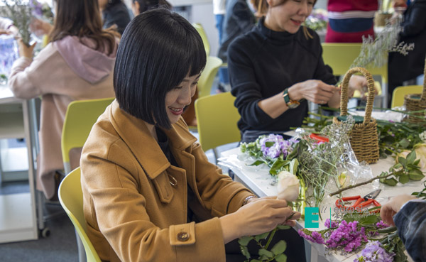 活动现场鲜花簇拥,芳香四溢。专业的花艺师首先对花材种类、插花的基本内涵、插花的原理法则、插花技巧等进行了讲解传授。在老师的指导培训下,众女神从花色及品种的挑选、修枝到搭配一一上手,将普通的花草打造成了赏心悦目的艺术品,不仅陶冶了艺术情操,也感受到了专业、专注、细致的生活态度和工作态度的重要性。