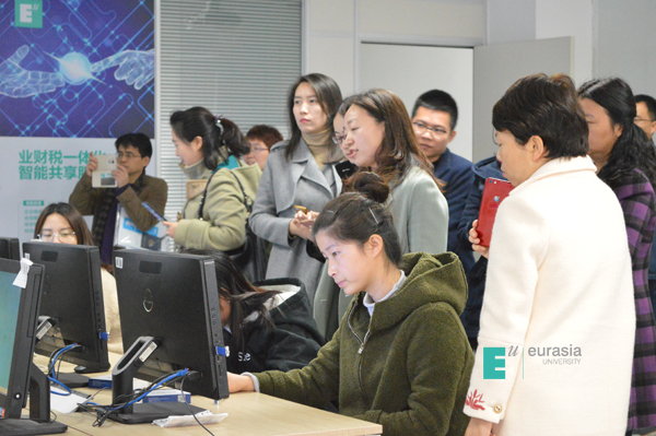 为了让与会的各位同仁更加直观的了解我院正在开展的校企合作项目,谢涛院长和谢晓妮老师带领各位与会同仁参观了我院独具特色的各类实训室。在财税一体化实训室中,谢老师展示了增值税、企业所得税纳税申报系统,发票填开系统,指出这些系统与真实税务系统的操作界面基本一致,学生在这里能够系统地学到真实业务。接下来参观了财税共享服务中心,对共享业务进行了深入的讲解,学生在这里可以接触到企业真实项目,对于提高学生财务共享业务技能有着很大的帮助。接着参观了审计信息化演练室、审计工作室、财务共享体验中心,老师们对于我院实训室建设水平表示充分肯定,并进行了密切的交流。