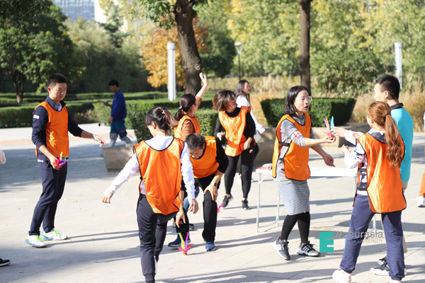 第五关:鼓动人心。大家迸住呼吸、轻轻拽动绳索,只求在那一刻“同心同德”,控制好那个小小的球,让它乖乖地在鼓上连续跳跃10下。鼓的一上一下,都牵动着大家的眼和心。这一刻,我们紧密在一起!