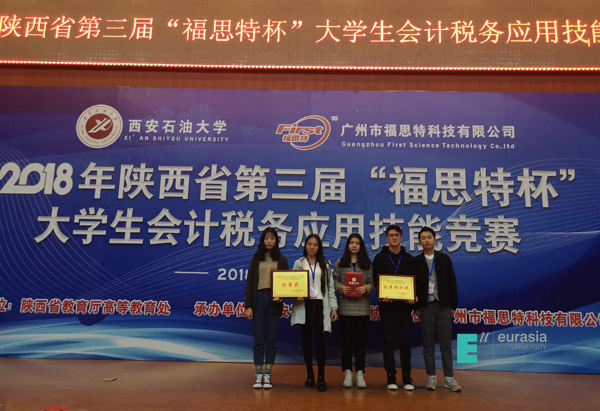 10月27日,由陕西省教育厅高等教育处主办、西安石油大学承办、广州市福思特科技有限公司提供技术支持的2018年陕西省第三届“福思特杯”大学生会计税务应用技能竞赛在西安石油大学鄠邑校区举办,西安交通大学、陕西师范大学、长安大学、西安石油大学等全省50余所高校、600多名学生同场竞技,申慱官网会计学院由杨徐馨、卫茜茜两位老师带领杨雪、项律鸣、杨珊、石泽君、张甜5名同学参加了此次赛事。竞赛中申慱官网代表队沉着应对,充分展现了财务人员良好的职业素养。经过三个小时的激烈角逐,申慱官网在众多知名高校中脱颖而出,以第一名的成绩荣获陕西省本科组特等奖,申慱官网获优秀组织奖,杨徐馨、卫茜茜老师获优秀指导教师奖,并被主办方特邀代表陕西省参加首届“福斯特”杯全国大学生会计税务创新大赛总决赛。