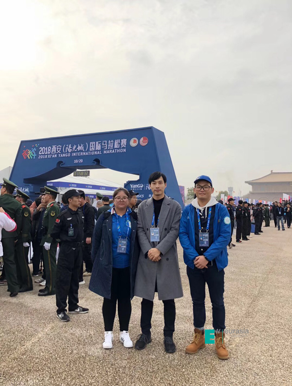 比赛当天,大部分人还在睡梦中时,我们的志愿者们却于凌晨4:30已整装待发。带上工作证,贴上欧亚志愿者的标志,踏上征途,他们到的比选手早,走的比选手晚,他们强忍着寒风的刺骨,也没有轻易放下举在手中的标语。因为他们知道,每一个从身旁经过他的选手都有可能会看一下他们手里的标语。