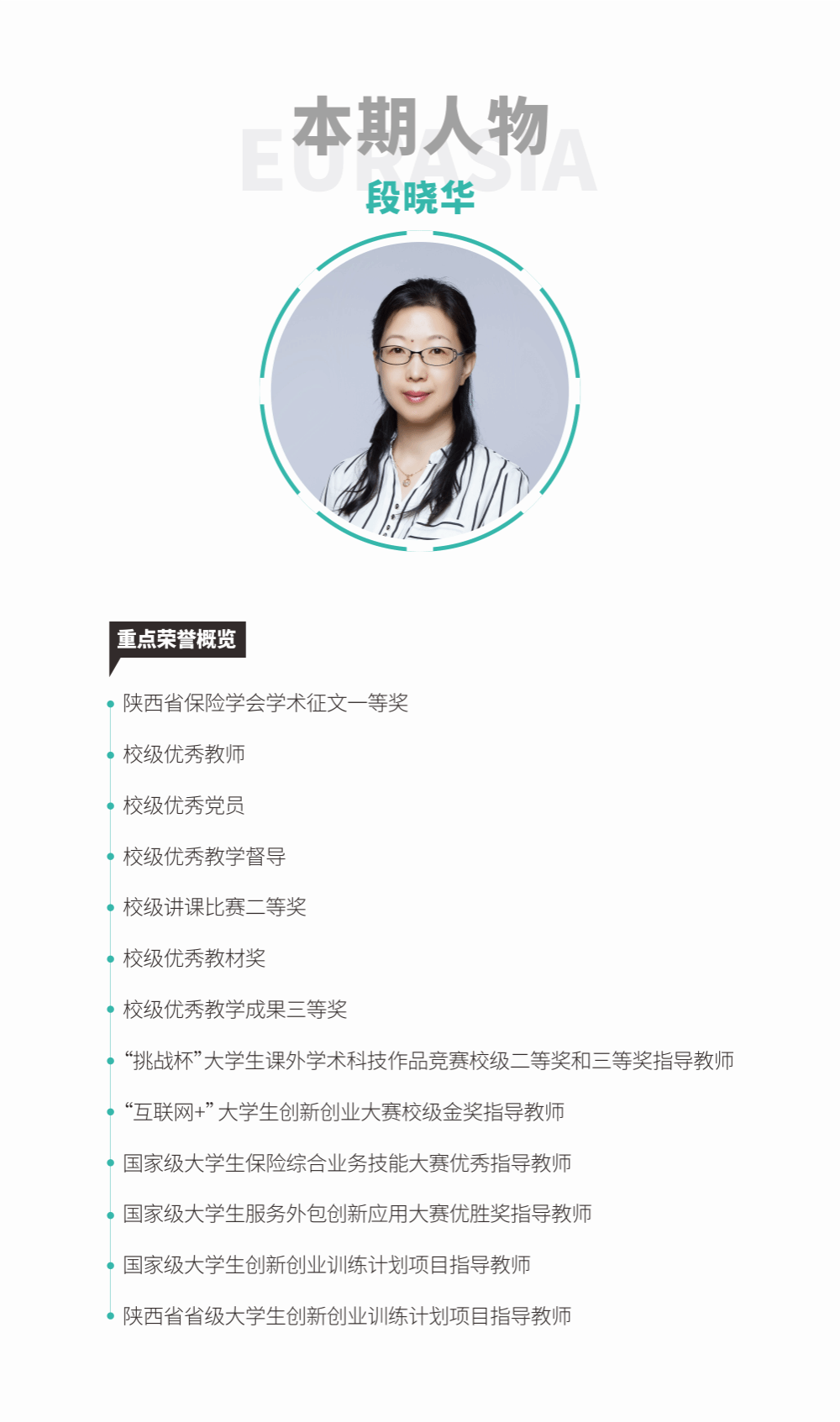 近日,陕西省第十三届普通本科高等学校教学名师获奖名单公布,申慱官网金融与数据科学学院教师段晓华获评。不同于从高校到高校的教师,来到欧亚学院之前,段晓华老师有着8年的企业工作历练,既让她积累了丰富的金融行业经验,为应用型教育打下坚实基础,更让其成为一座「桥」,人、教育、企业因她而变得互联互通。