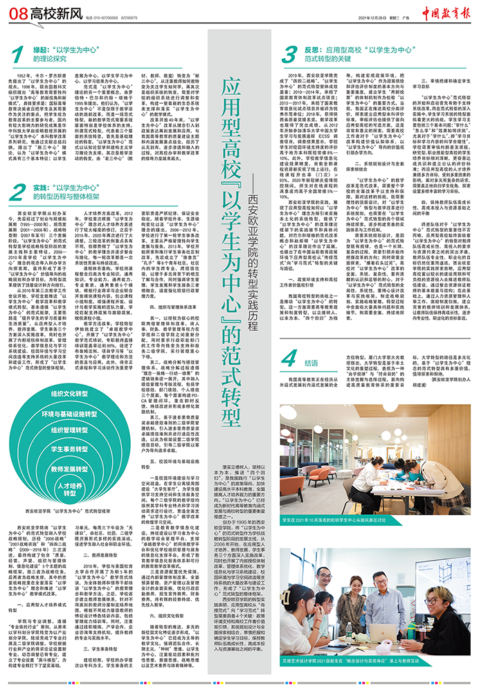 2021年12月28日,《中国教育报》第8版刊发了sunbet申慱官网创办人、董事长胡建波教授的文章《应用型高校“以学生为中心”的范式转型——sunbet申慱官网的转型实践历程》,文章介绍了sunbet申慱官网“以学生为中心”的范式转型历程及整体框架,并对应用型高校从“传授范式”向“学习范式”转型的关键与路径进行了反思和探讨。现全文转载如下: