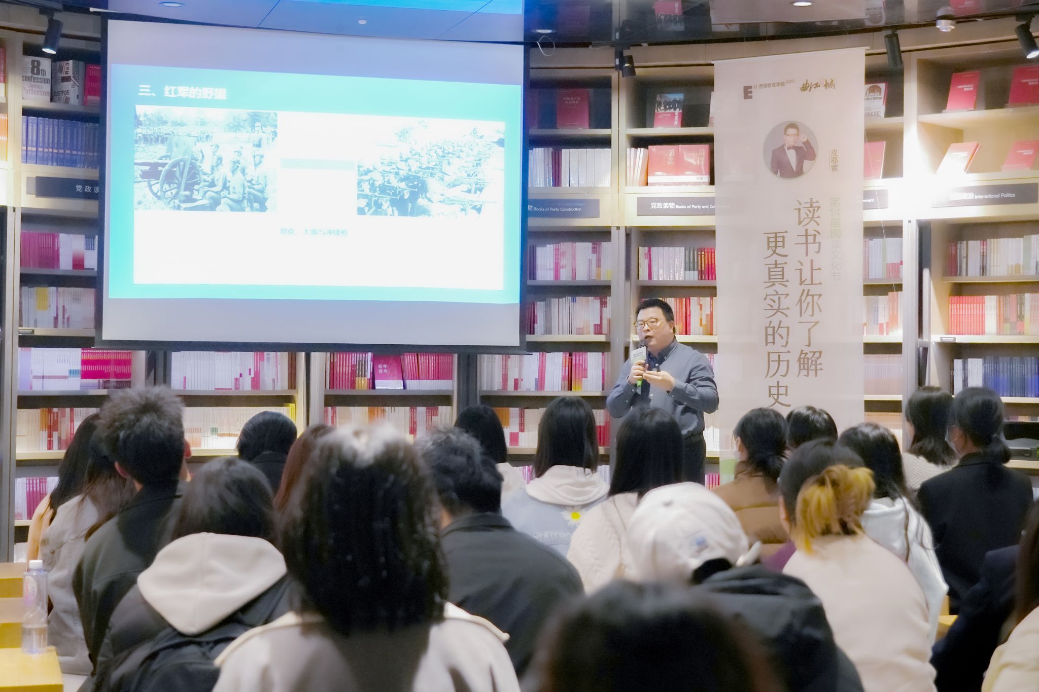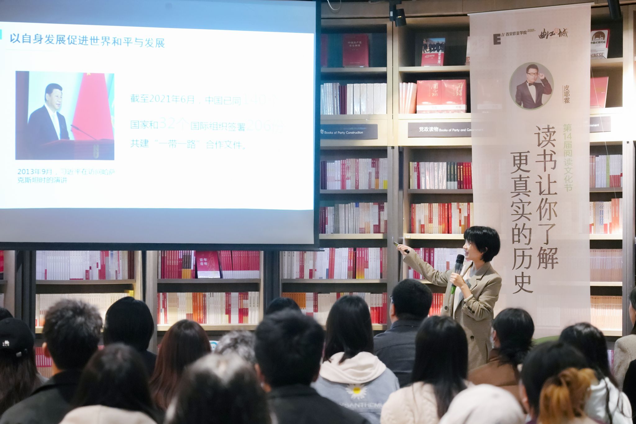 对于今天的青年人而言,在不确定性成为普遍共识的当下,如何寻找确定的自我存在、应对越渐变革的未来?党的二十大报告总结了过去5年的工作和新时代10年的伟大变革,整体概括了国内国际社会大环境发生的变化。对于青年群体及至广大群众群体来说,党的二十大报告是值得不断学习和研究的经典范本。在欧亚,学校党委从落实立德树人根本任务出发,推动学校思政课改革创新,打造了一支优秀的思政课教师队伍,在陕西高校思政课教师“大练兵”主题活动中,思政课教师连续五年获得佳绩。本届阅读文化节邀请到通识教育学院教师毛笑雯,以中国和平发展故事为线索,带来一场领读分享。