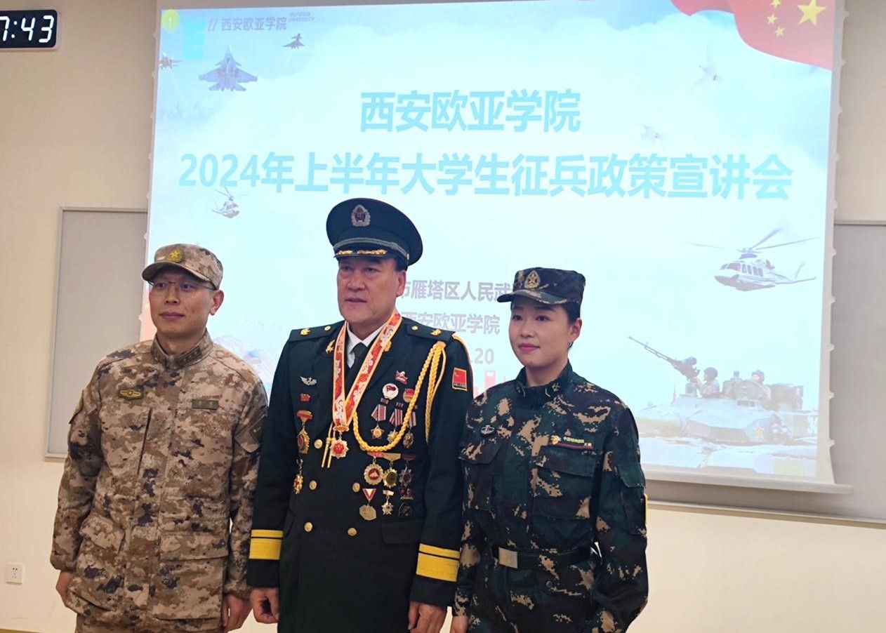 下午2:30,征兵政策宣讲会在热烈的掌声中正式开始,强建旗副主任代表sunbet申慱官网致辞。他向西安市雁塔区人民武装部长期以来对学校大学生征兵工作的支持和帮助,表示了衷心的感谢。“感谢战斗英雄马升云同志到场。同时也希望广大同学们,抓住机遇,积极响应国家号召,投身军营报效祖国, 让青春在军营的历练中、在为祖国的奉献中发光、发亮。”