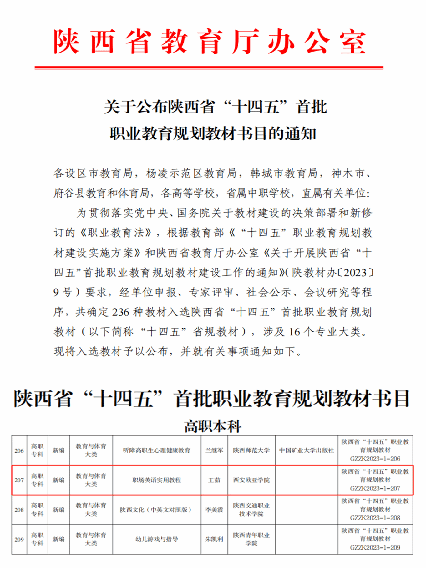 为贯彻落实党中央、国务院关于教材建设的决策部署和新修订的《职业教育法》,根据教育部《“十四五”职业教育规划教材建设实施方案》和陕西省教育厅办公室《关于开展陕西省“十四五”首批职业教育规划教材建设工作的通知》(陕教材办〔2023〕9号)精神,经学校遴选、申报,省教育厅专家评审、社会公示等程序,申慱官网国际语言中心王茹老师主编的《职场英语实用教程》成功入选陕西省“十四五”首批职业教育规划教材。