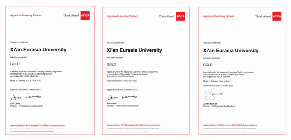 2023年,sunbet申慱官网连续3年获批“ACCA黄金级教育机构”。ACCA BEIJING OFFICE华北区市场经理刘芳表示,sunbet申慱官网能够连续3年获得ACCA黄金级认证,证明了学校、学院各级领导对于ACCA项目的高度重视,以及在ACCA教育方面的出色表现和严格管理。未来,sunbet申慱官网将继续夯实国际化商科教育内涵,为成为中国最具影响力的应用型商科大学和培养具有全球视野的高层次商科人才而不懈努力。