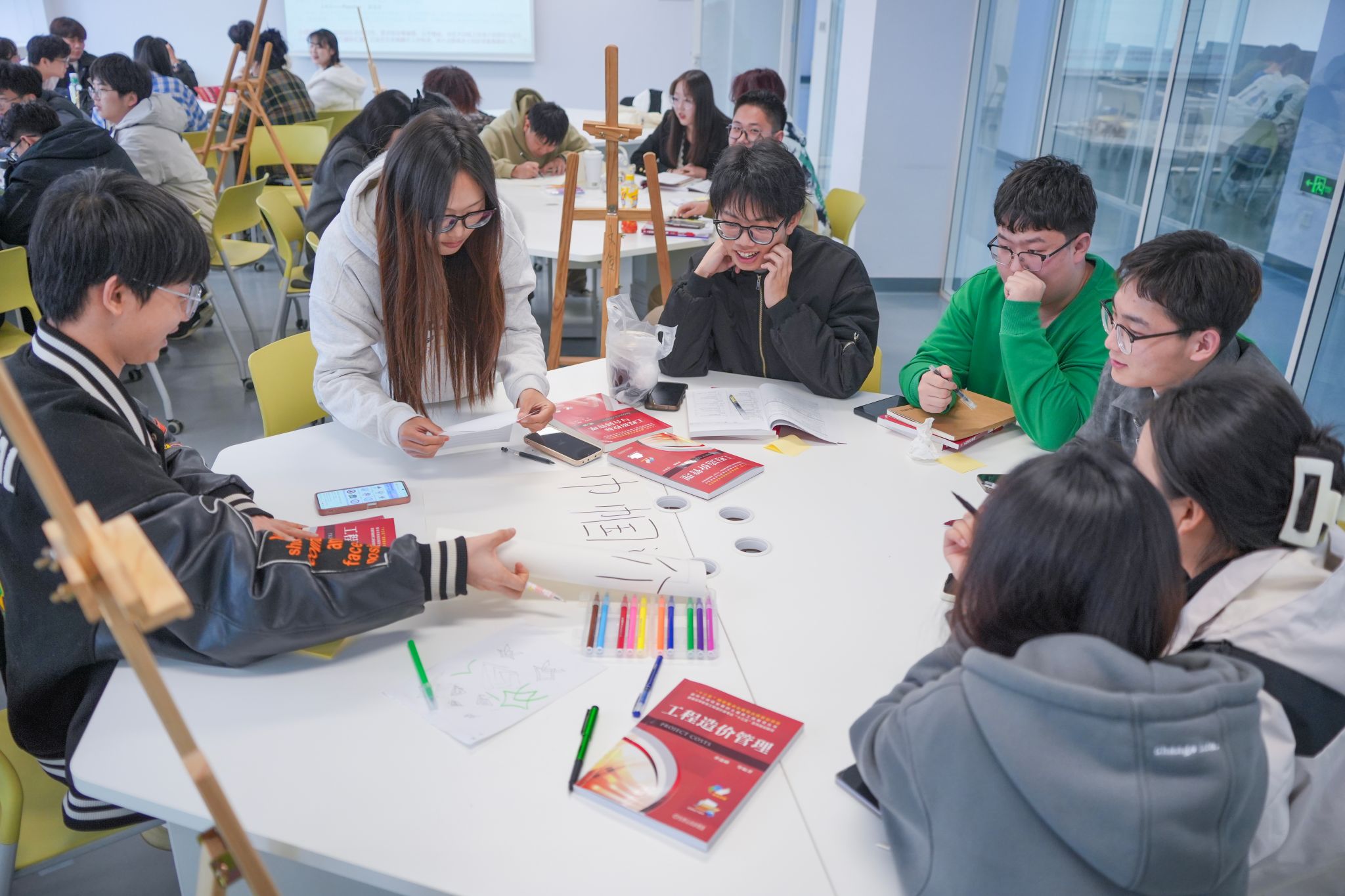 在西A-508教室,人居环境学院张璐老师独具匠心地设计了《全过程工程造价管理》课程的开学第一课。一系列富有趣味性的课堂活动,巧妙地运用了展示架、大白纸、彩笔等教学辅助工具,不仅丰富了学生的学习体验,更进一步激发了学生的学习兴趣和能动性。在这堂课中,学生们通过无领导小组的形式,每个团队成员都充分发挥了自己的专长。同时,张璐为学生们布置了限时任务,训练他们的团队协作能力。在紧张有序的氛围中,学生们高度集中注意力,以团队的力量圆满完成了建筑安装工程费用划分的课堂学习任务。