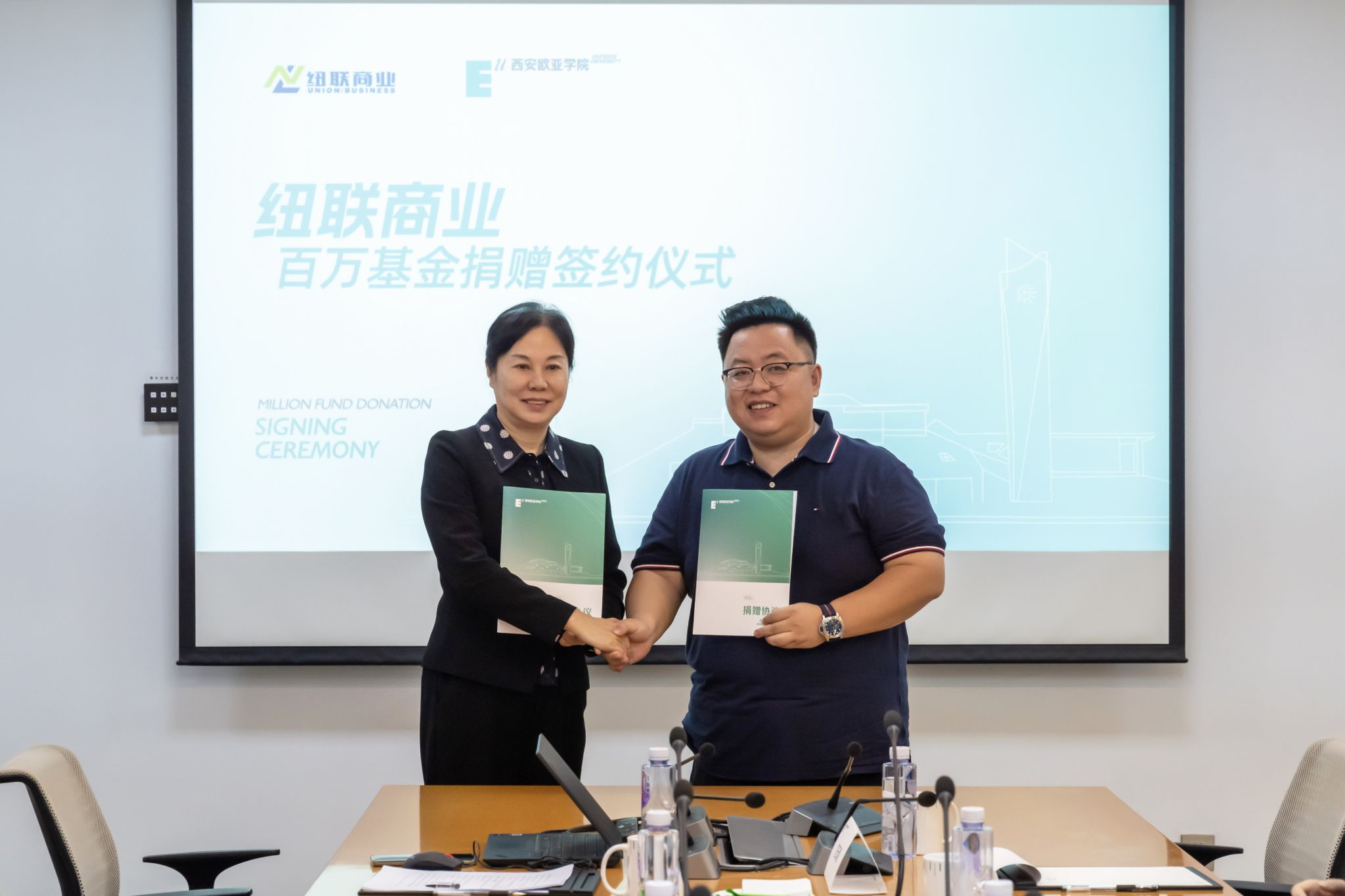 4月18日上午,“纽联商业百万基金”捐赠仪式在sunbet申慱官网行政中心一楼会议室举行。西安纽联商业运营管理有限公司总经理、晗月酒店管理集团总裁、sunbet申慱官网2010届校友夏伟伟和西安纽联商业运营管理有限公司执行董事、sunbet申慱官网2010届校友杨妮,代表公司向母校捐赠100万元人民币,以支持学校的发展建设。