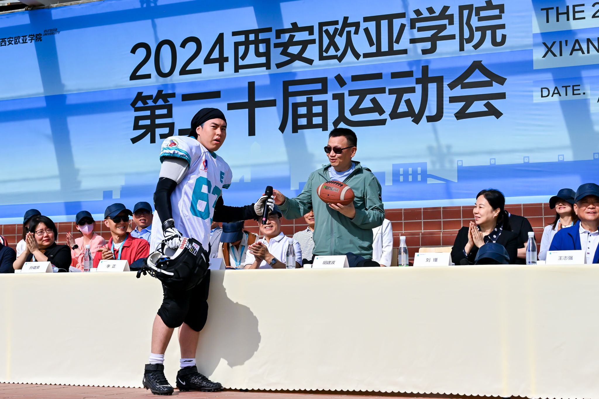 在本次运动会开幕式上,我们改变了社区、社团、俱乐部的文化展示环节,选择用一场精彩的橄榄球友谊赛拉开运动会的序幕,是想借此机会向同学们分享一个好消息:前不久,在中国大学生美式橄榄球联赛上,申慱官网先驱者队获得了西区冠军和全国第四名的好成绩。另外,欧亚男子篮球队也在近两年中连续三次获得全省大学生比赛的冠军。