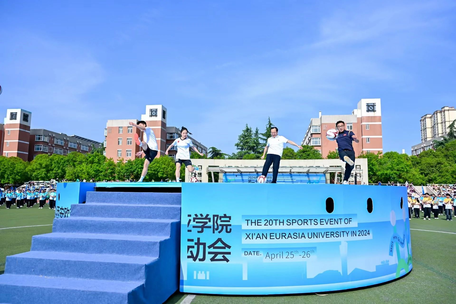 学校党委书记赵国华教授、通识教育学院体育中心雷康老师和会计学院、德鲁克青年社区的孙浩源同学、职业教育学院、Jobs青年社区樊佳荣同学,一起跑向运动场中央,全力以赴踢出梦想之球,开启新的希望。