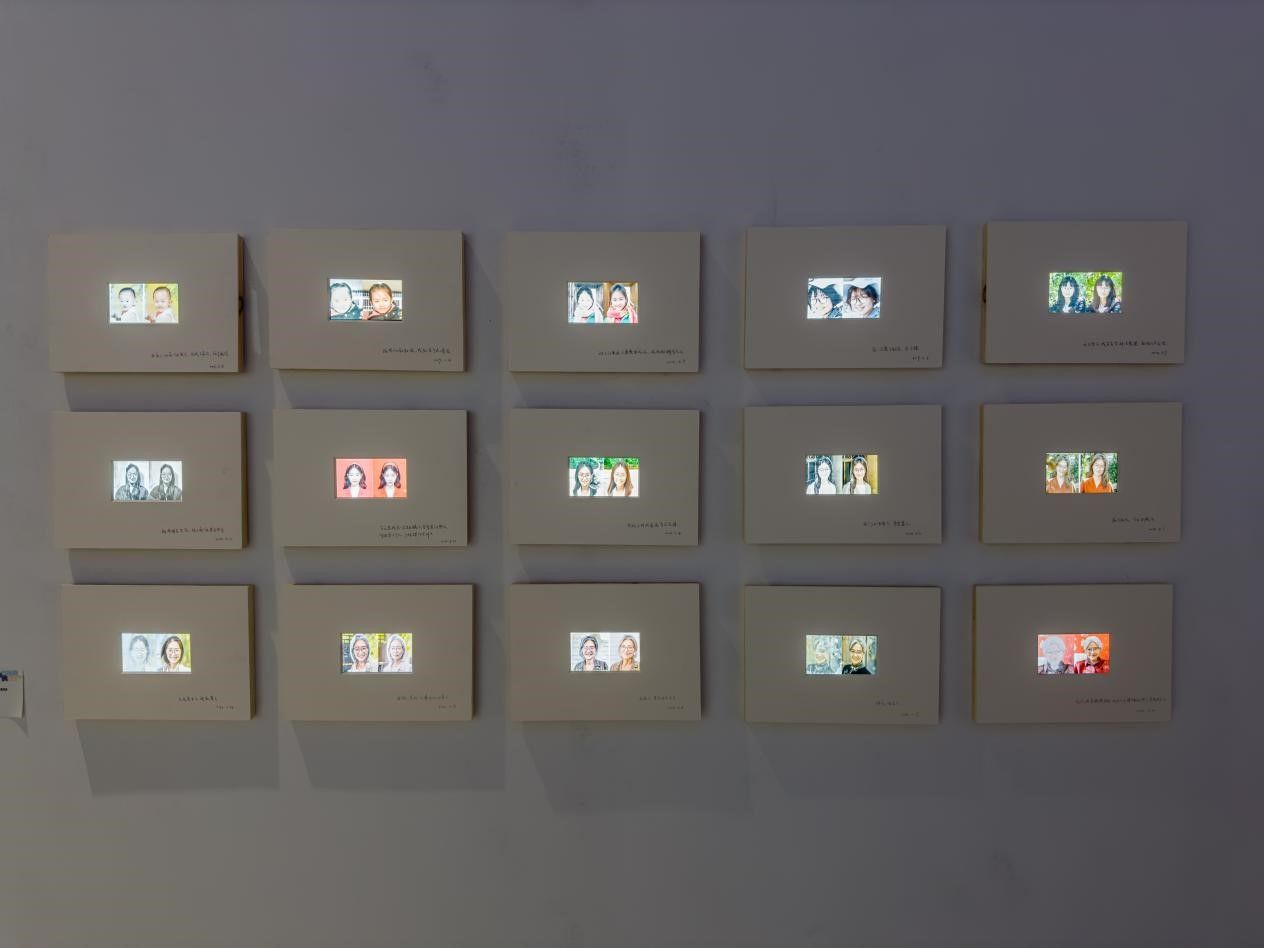 最终,他们将生成的15组照片浓缩了赵一鸣的一生。从1岁到84岁,每组照片由静、动两张构成,22岁前的静态照片主要来自老照片,其他均由AI生成。“静动、新旧结合,是我想体现AI既修复又创造的特质。”赵一鸣说道。照片旁还放着插着各种颜色线的4个黑色矩形框,团队成员王佳宇说:“这实际是一个扫描仪,只要感应到人,即可在一旁的荧幕上生成不同的AI造型。”