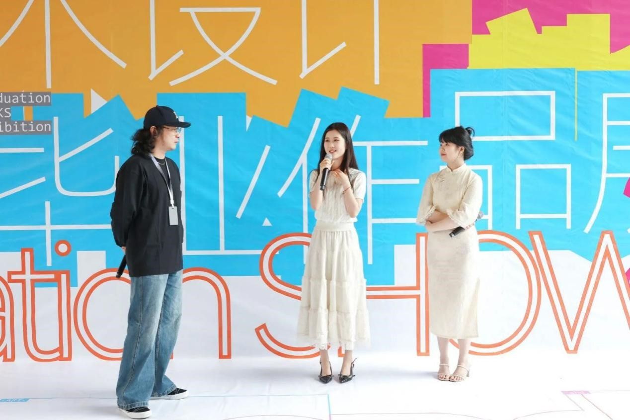 (图十)梅雨婷(中)与王菲(右一)在毕业设计展开幕式中发言