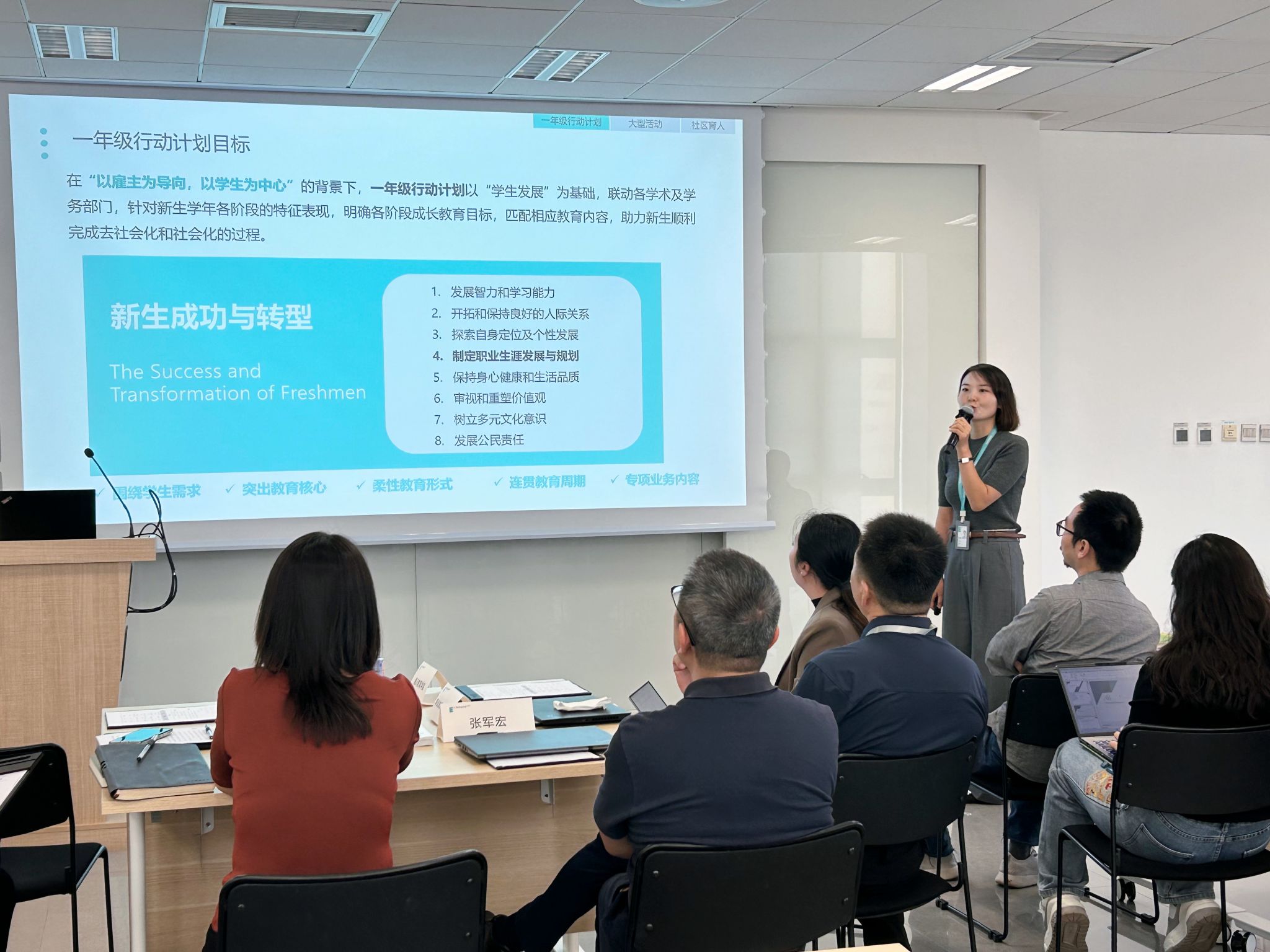 副校长张乐芳强调,学生事务各项工作要紧密聚焦学校发展大局,注重目标可衡量,发展可持续。同时,“一年级行动计划”非活动联动,应整合数据,实现数据驱动协同,针对新生体验营三个篇章也提出相应要求。