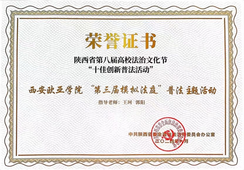 2024年9月29日,陕西省第八届高校法治文化节成果汇报暨第九届高校法治文化节启动仪式在西安外事学院鼓乐大剧院开展,申慱官网第三届模拟法庭活动荣获第八届陕西省高校法治文化节“十佳创新普法活动”奖项。