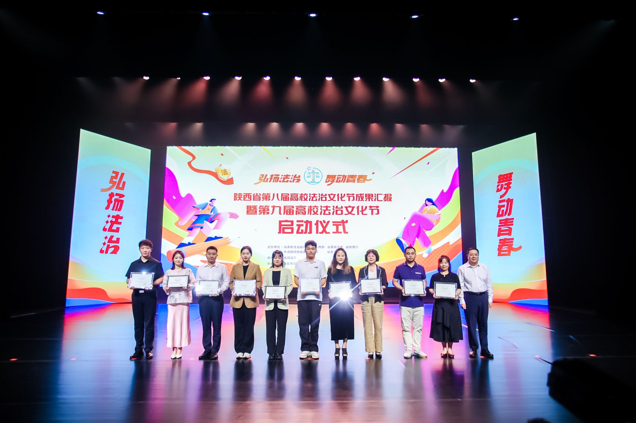 本次活动以“弘扬法治,舞动青春”为主题,由省委依法治省办、省委宣传部、省委政法委、省教育厅、共青团陕西省委、省妇联、省关工委主办、省司法厅承办、西安市司法局、西安外事学院协办。现场对高校“十佳创新普法活动”、“法治优秀作品”、“法典先锋”冲关答题挑战赛获奖选手、第八届陕西省高校法治文化节优秀组织单位进行表彰。