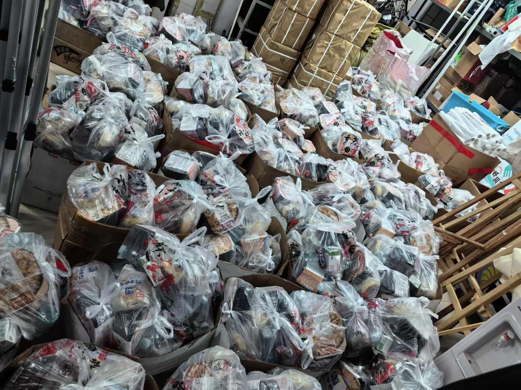 (图五)“堆积成山”的志愿者餐包