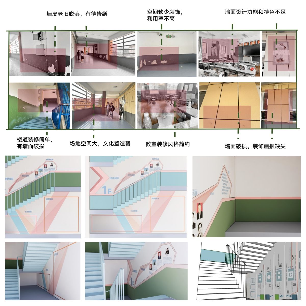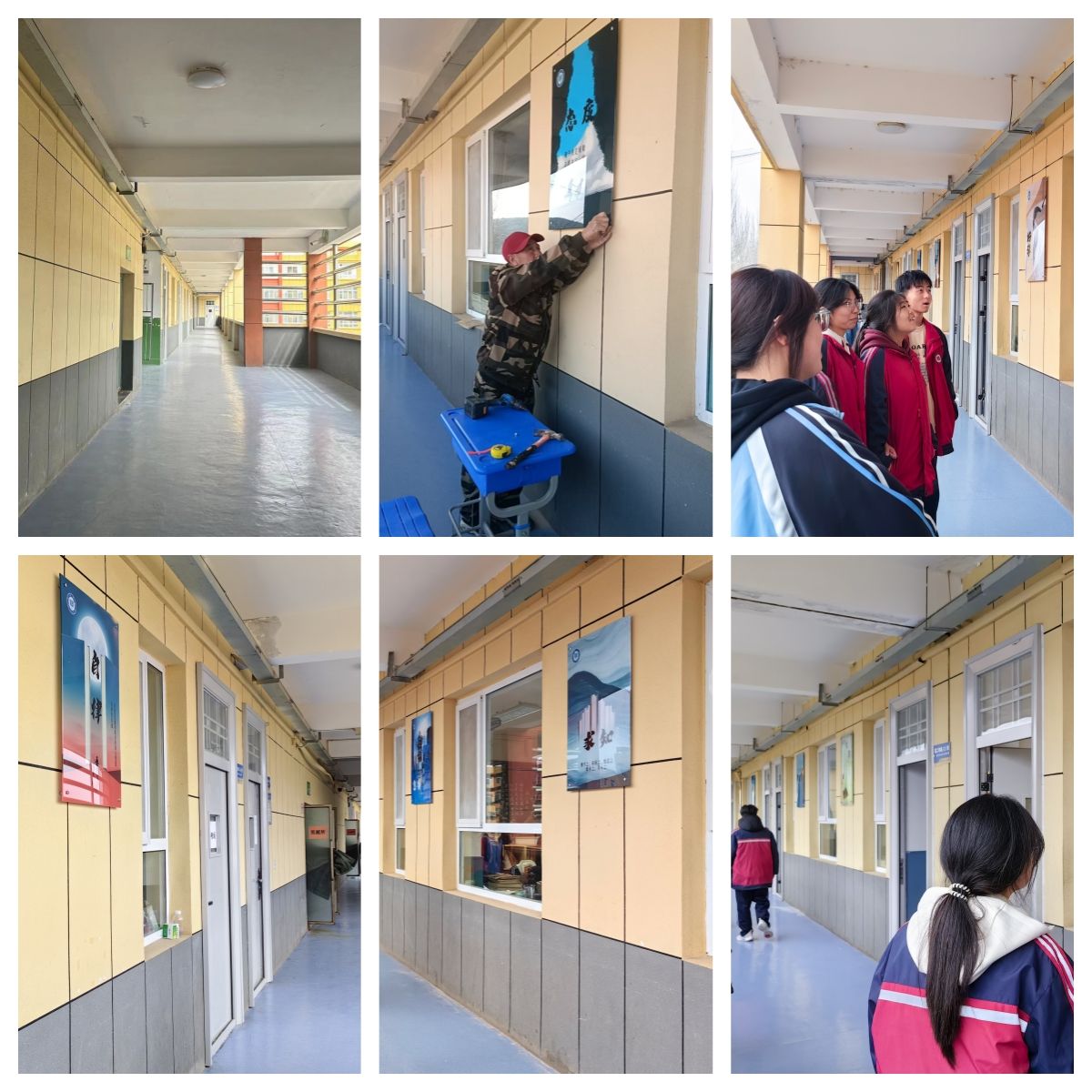 基于教学楼环境现状,9 月-10 月期间,师生团队与清涧中学及施工单位三方多次开展网络会议沟通协调,反复推敲改造设计内容及设计方案。考虑教学空间视觉元素单一,楼梯间、走廊、教室等区域的墙面陈旧脱落等问题进行空间设计图制作;为了改善公共区域的视觉效果,丰富学生的课余精神生活,在教学楼 1至 3 层的公共走廊及教室外墙区域增设核心校园文化展示墙:如诚信、梦想、责任、自律、拼搏、创新……校园文化角36 处;针对教室空间功能及色彩单一的情况,在 30 间教室前后墙面增设统一的信息栏、告示栏,以提升教学设施的实用性和美观性。清涧中学全程参与施工的组织和管理,项目进展井然有序。