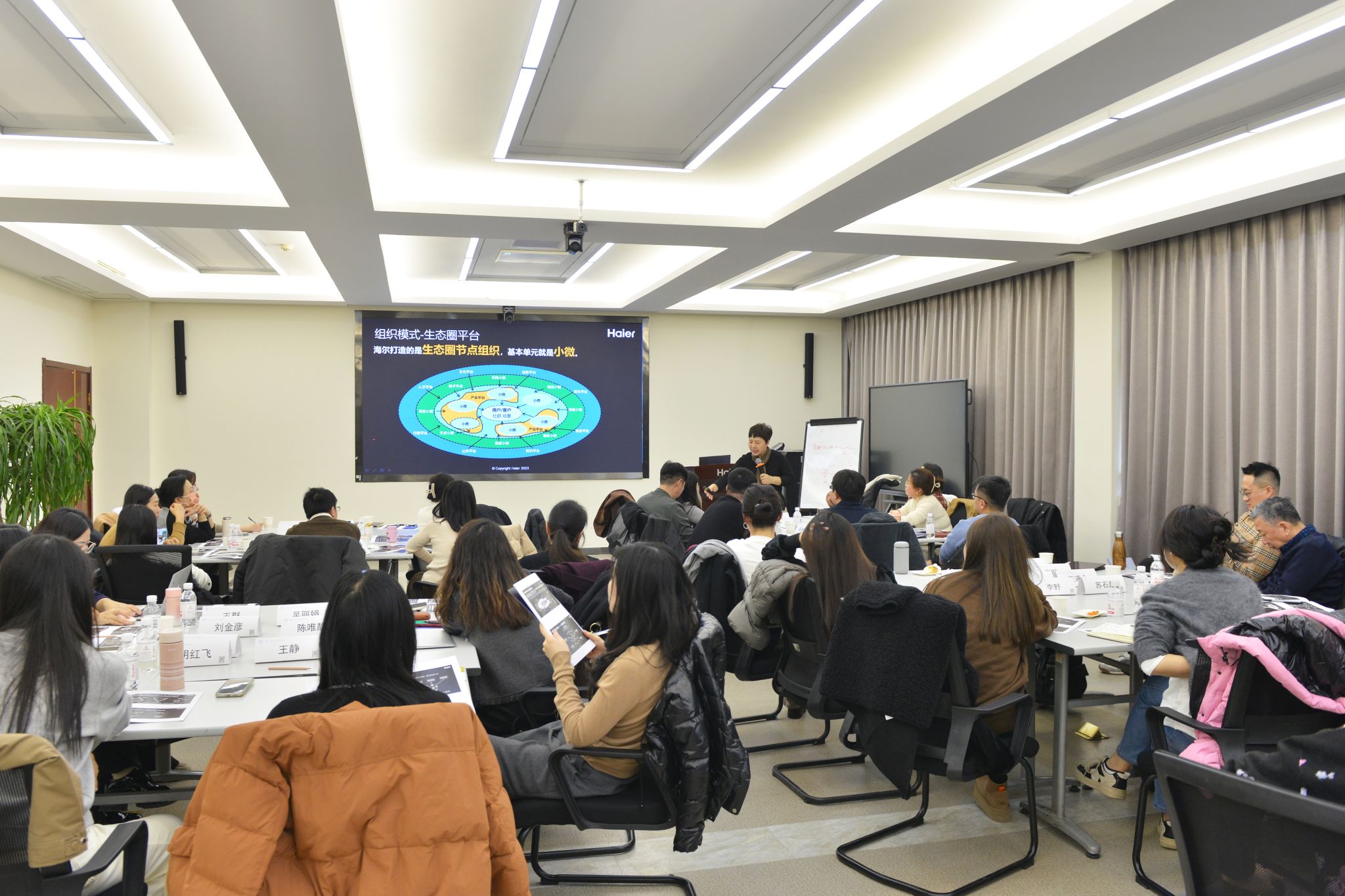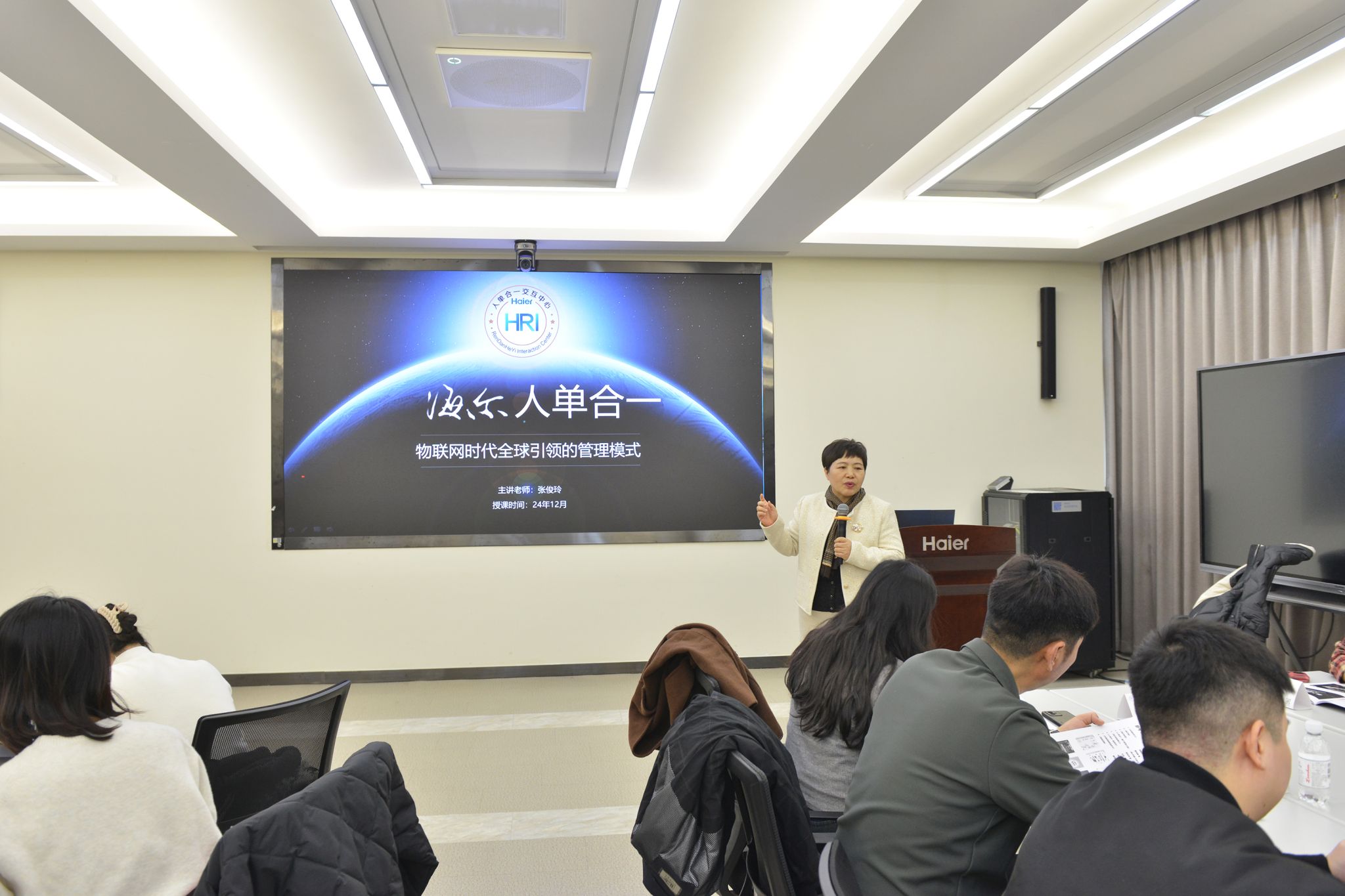 教师们在参观时便对海尔学校“人单合一”的教育理念有了一定的认识和理解。随后,海尔集团资深人力资源管理讲师张俊玲所开展的 “人单合一”精要课程深入阐述了“人单合一”理念的时代背景、转型逻辑及落地方法。