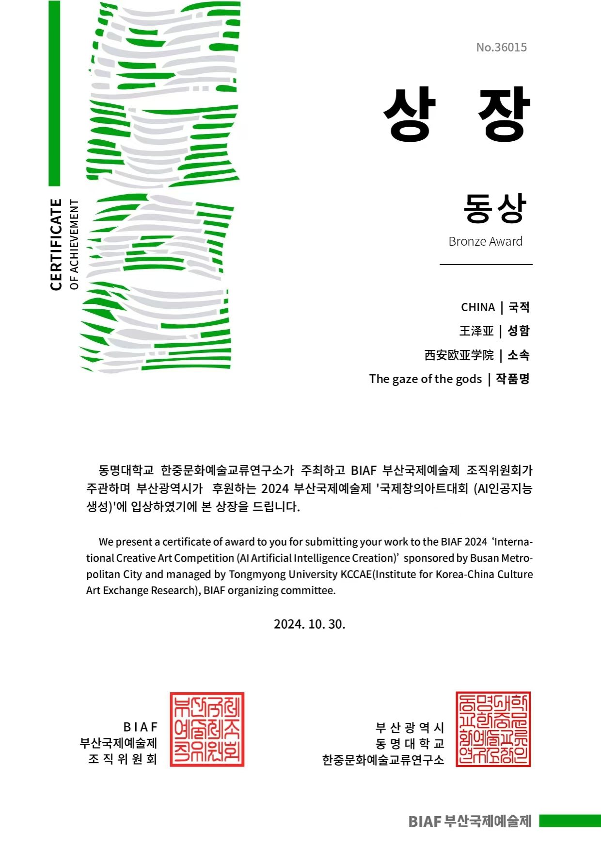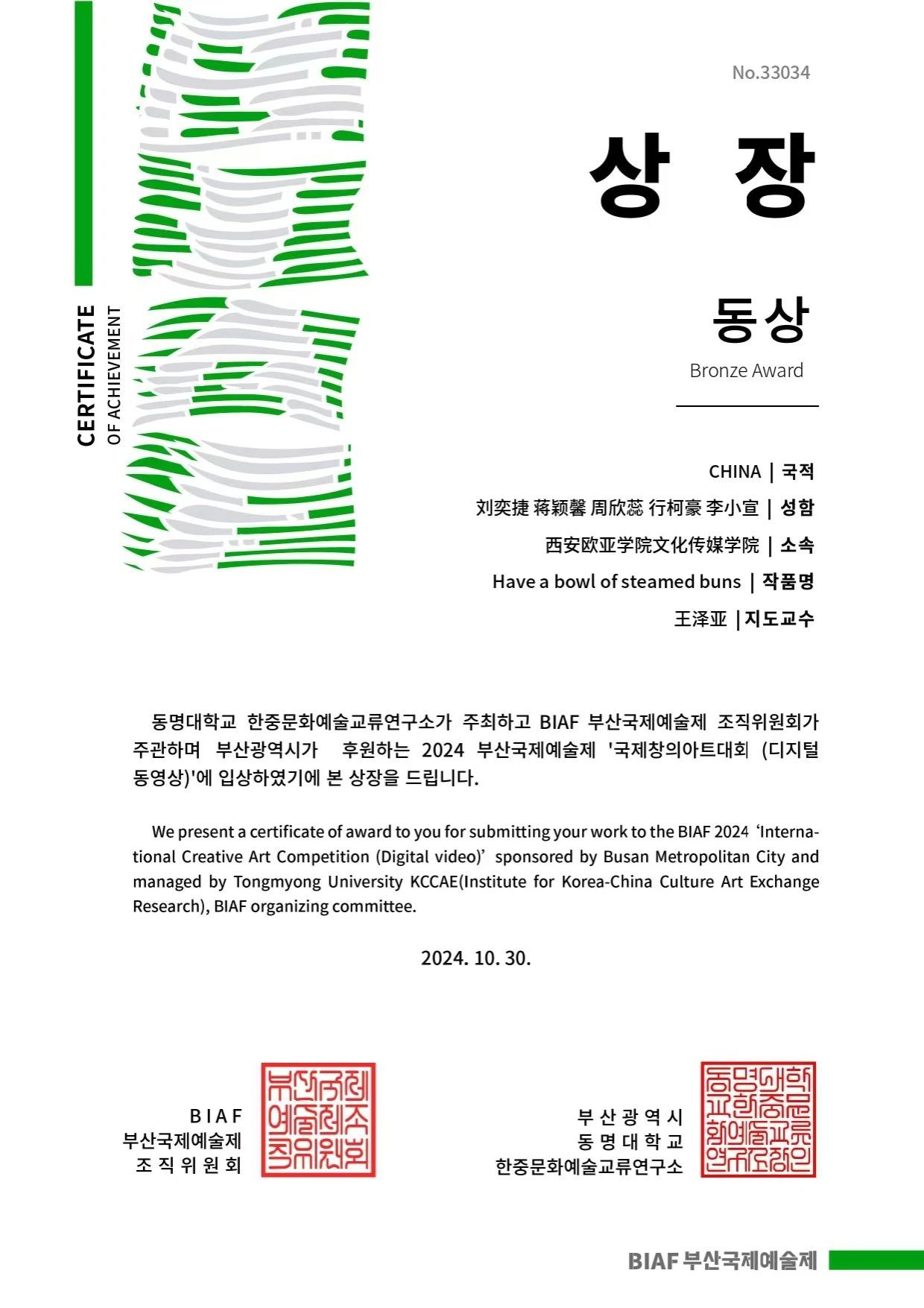 釜山国际艺术节(Busan International Art Festival,简称BIAF),是国际文明互鉴、文化交流的平台和桥梁。2024年10月30日,韩国釜山国际艺术节在釜山广域市厅展厅盛大开幕,主题是“美丽的未来”。在这个充满激情与创意的舞台上,来自全球70个国家的艺术家、创作者及艺术团体齐聚一堂,共有1122件作品脱颖而出。