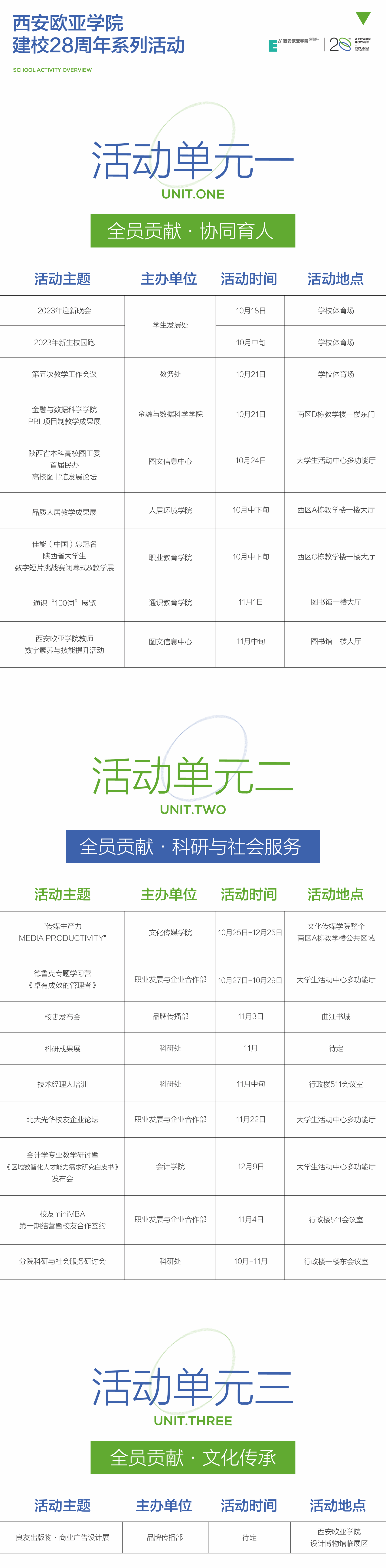 此次28周年校庆活动,围绕现代大学的职责进行打造,以三大单元为主线,与众多院系、职能部门一道,为大家带来包括教育、科研与社会服务、文化传承的精彩活动,也从不同的板块中感受欧亚教师的多元贡献与付出。欢迎广大师生、校友、社会同仁参加,共同见证欧亚又一年的成长与变化!