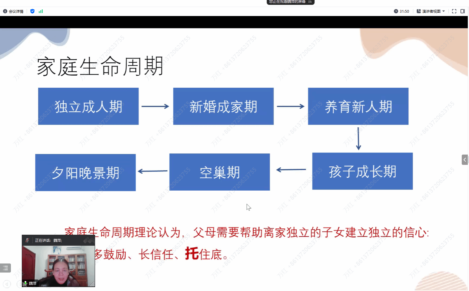 讲座伊始,魏老师向家长们详细地介绍了家庭生命周期理论,即父母需要帮助离家子女建立独立的信心,在日常尽量做到“少指导、多鼓励、长信任、托住底”,并讲授了社会心理发展阶段以及家长生理与心理的变化,引导大学生家长由良师和教练转型成为益友和顾问。