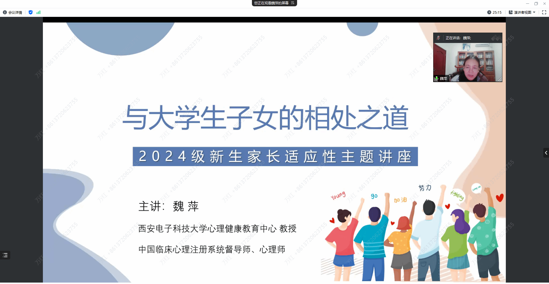 本期讲座以线上形式开展,主题为“与大学生子女的相处之道——2024级新生家长适应性主题讲座”。本次特邀西安电子科技大学心理健康中心主任魏萍教授主讲,2024级新生家长、新生辅导员、二级心理辅导站老师以及心理咨询中心全体老师参加了本次活动。