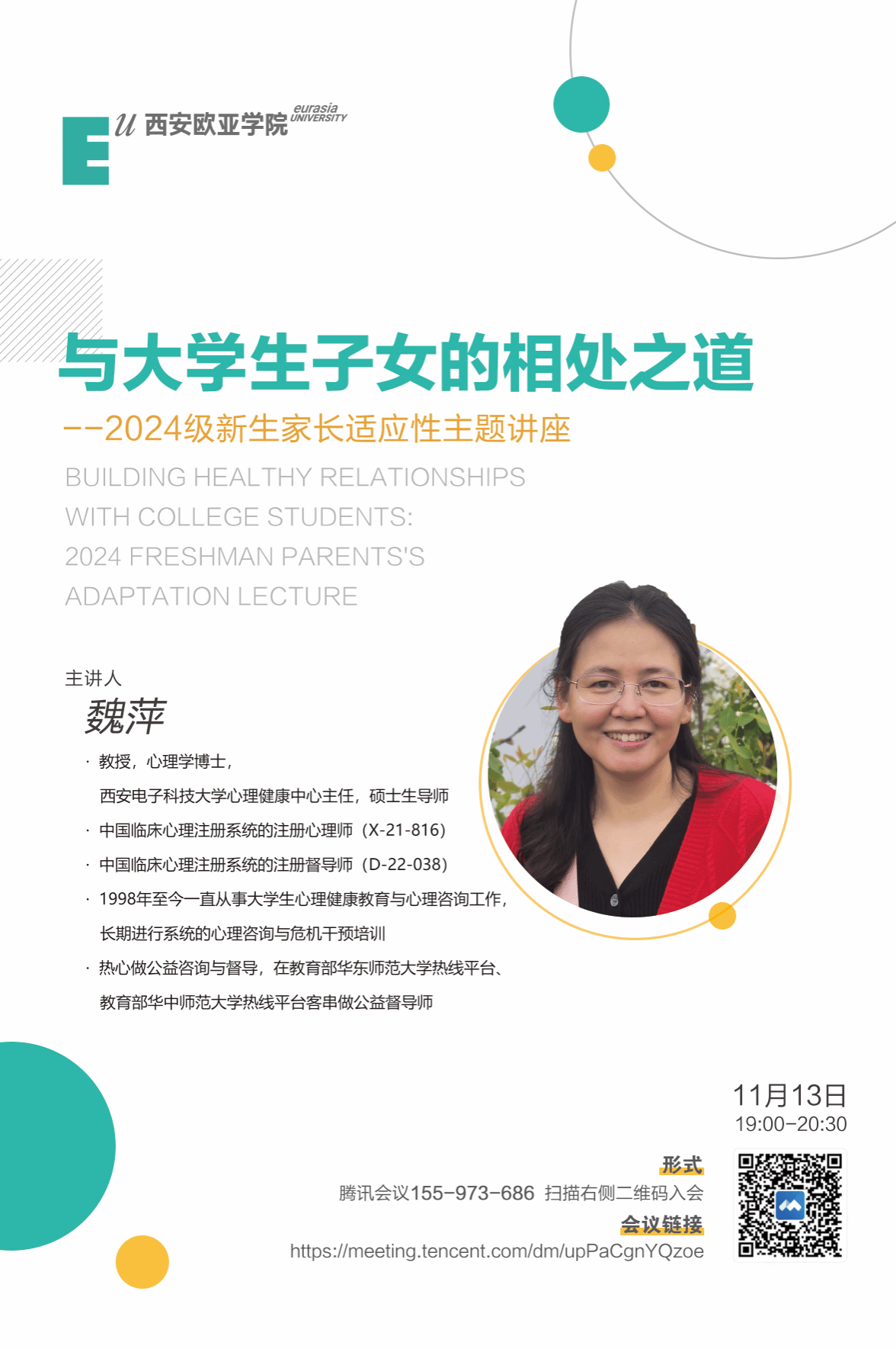 学生心理咨询中心老师向家长们介绍了学校各青年社区、分院学生事务中心、学生心理咨询中心的联系方式,以及“欧亚学生生活辅导”微信公众号,引导家长多了解学生在学校的生活,加强与学生的同频沟通及对学生心理健康的关注。