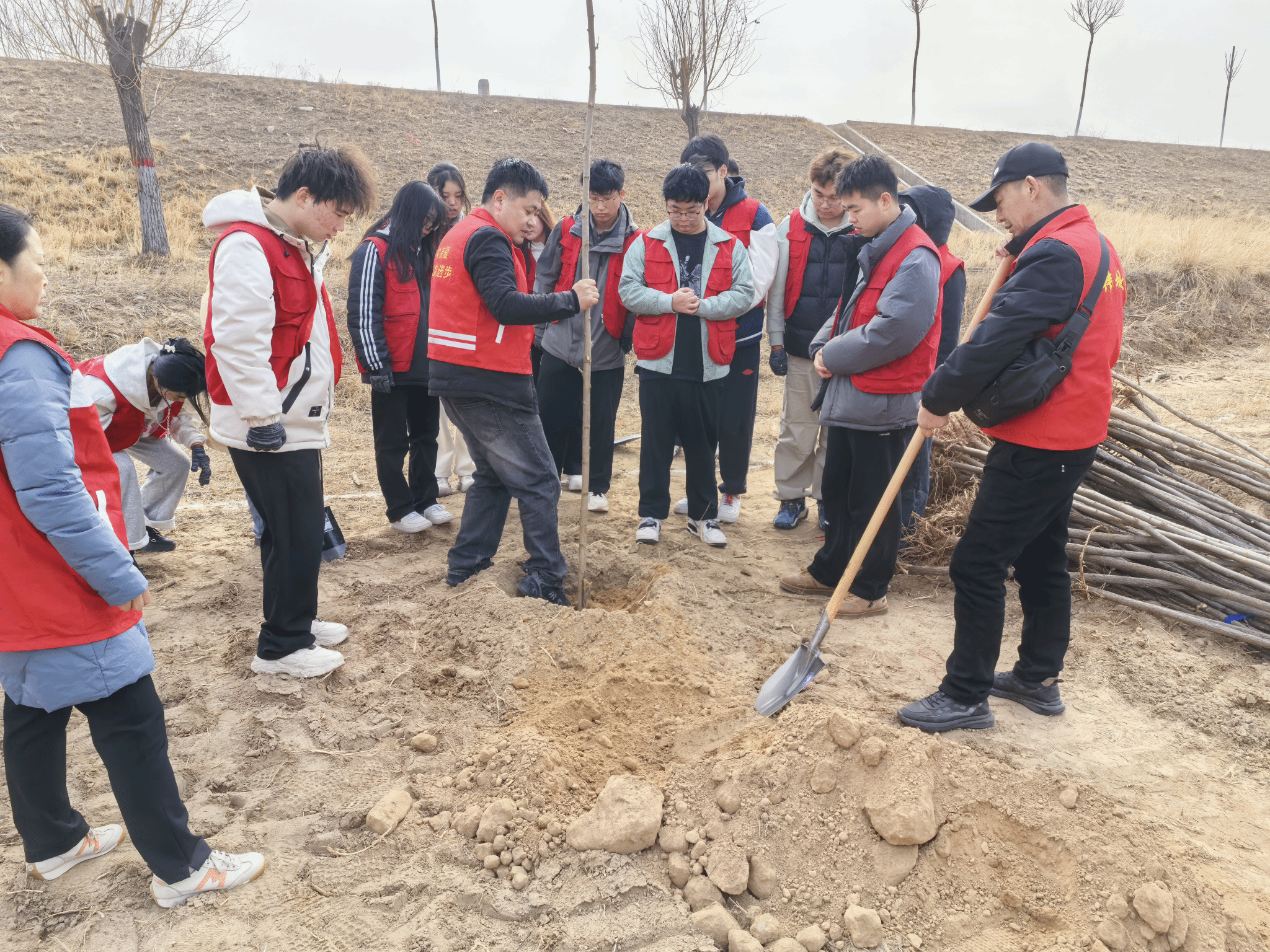 活动现场,林业技术人员全程指导,从树坑深度到土壤回填细节,志愿者们认真学习,将环保理念融入实践。欧亚学子以小组形式配合,有的负责扶正树苗,有的填土夯实,团队协作间展现出的高效与默契,成为春日里最动人的风景。活动共栽种杨树、侧柏等苗木千余株,为澽水河畔增添了一片生机勃勃的“青年林”。