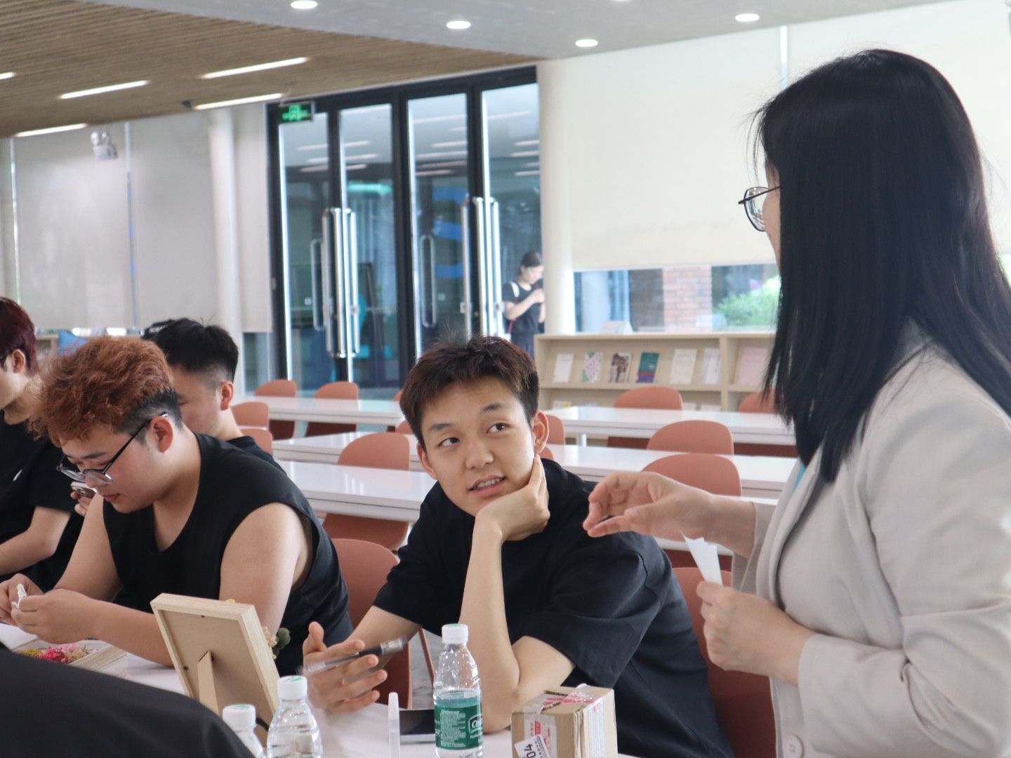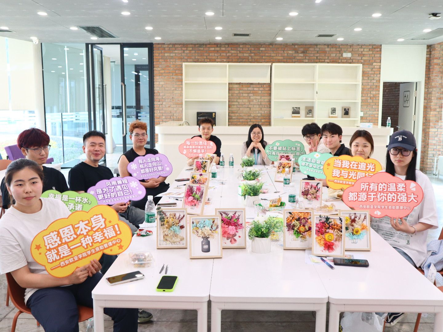 DIY手工制作环节,同学们围绕感恩永生花搭配大展身手。大家充分发挥创意,将一朵朵象征感恩与希望的永生花精心排布于相框之中。在制作过程里,同学们时而交流、时而认真制作、相互帮助,现场氛围其乐融融,一个个独具匠心的相框作品新鲜出炉,承载着同学们的巧思与欢乐,更承载着彼此协作的情谊。