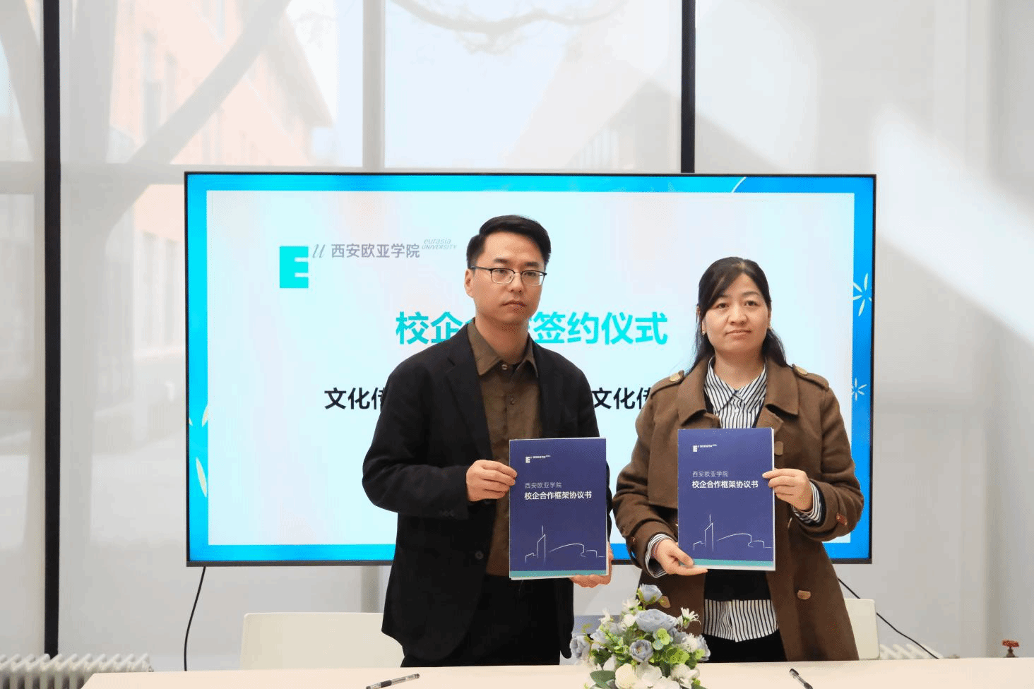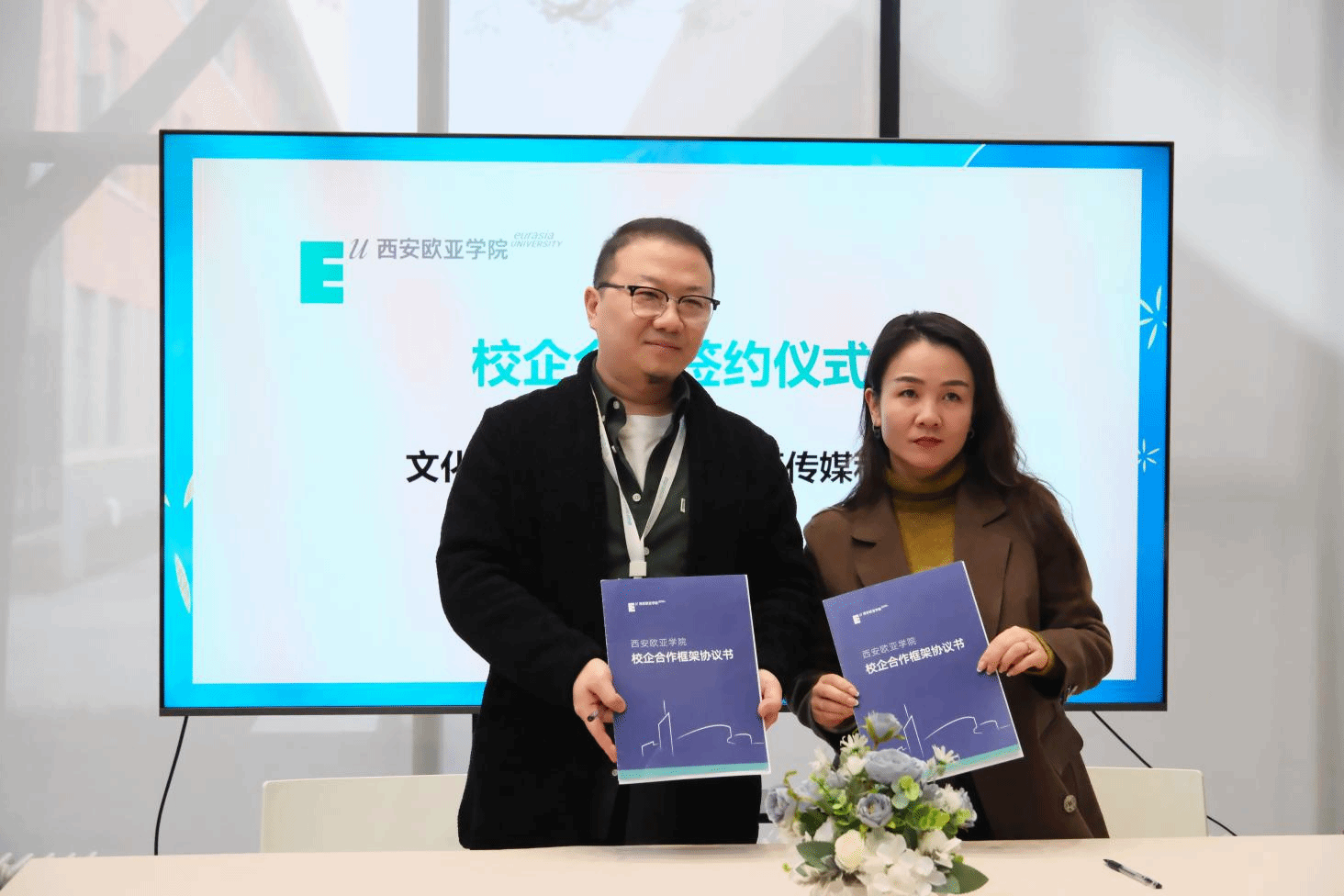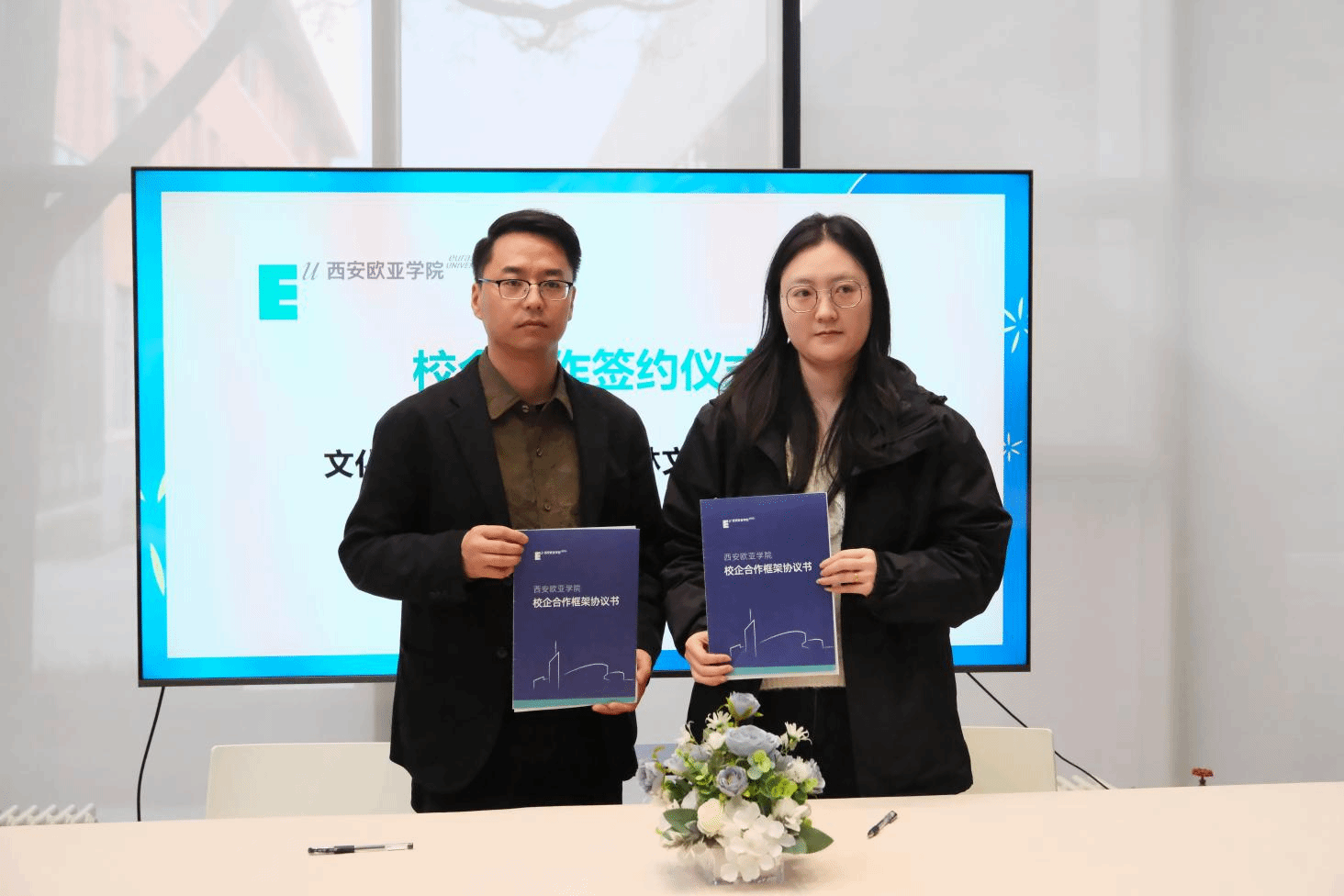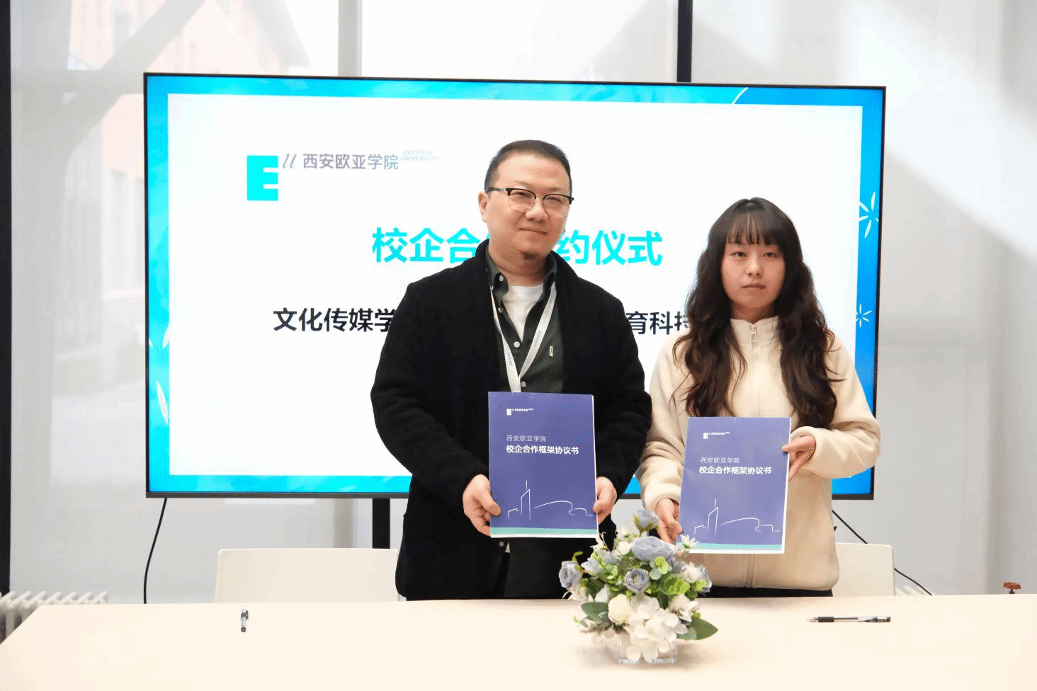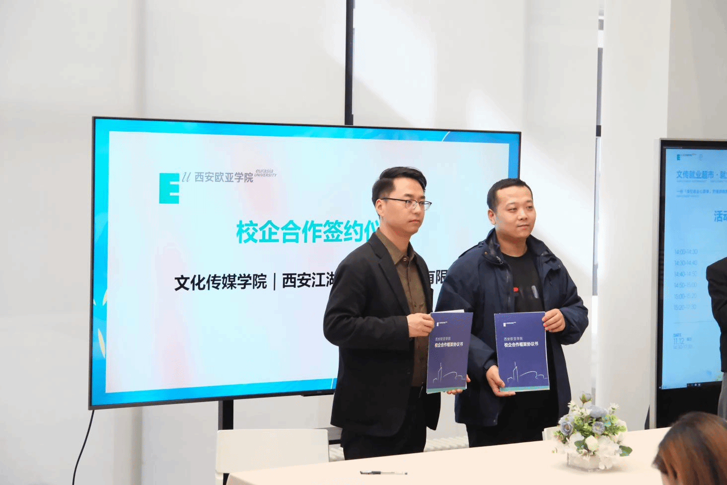 随后,在校企合作签约环节中,文化传媒学院院长助理雷方超和院长助理陈哲代表分院,与西安江湖映画动漫文化有限公司、西安九五天成文化传播有限公司、陕西乐颂文化传媒有限公司、陕西翰林文化发展有限公司、陕西商脉传媒有限公司、北京聪明核桃教育科技有限公司、旷世传声传媒科技集团共7家企业签署合作协议。