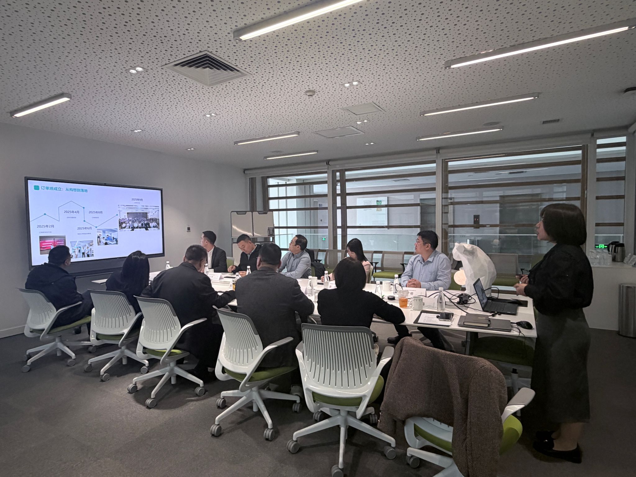 首先胡建波董事长对软通教育林涛总裁、李佳主任及郝少杰总经理一行的到来致以热烈欢迎。接下来软件工程专业主理人赵向梅老师介绍数字技术订单班的培养阶段性成果,学生专业能力与综合素养实现双提升,在师资供给、资源支持与辅导服务等方面均获得订单班学生高度认可。校企双方共建工作室、共办赛事活动、共育数字技术人才,进一步夯实了校企合作基础。