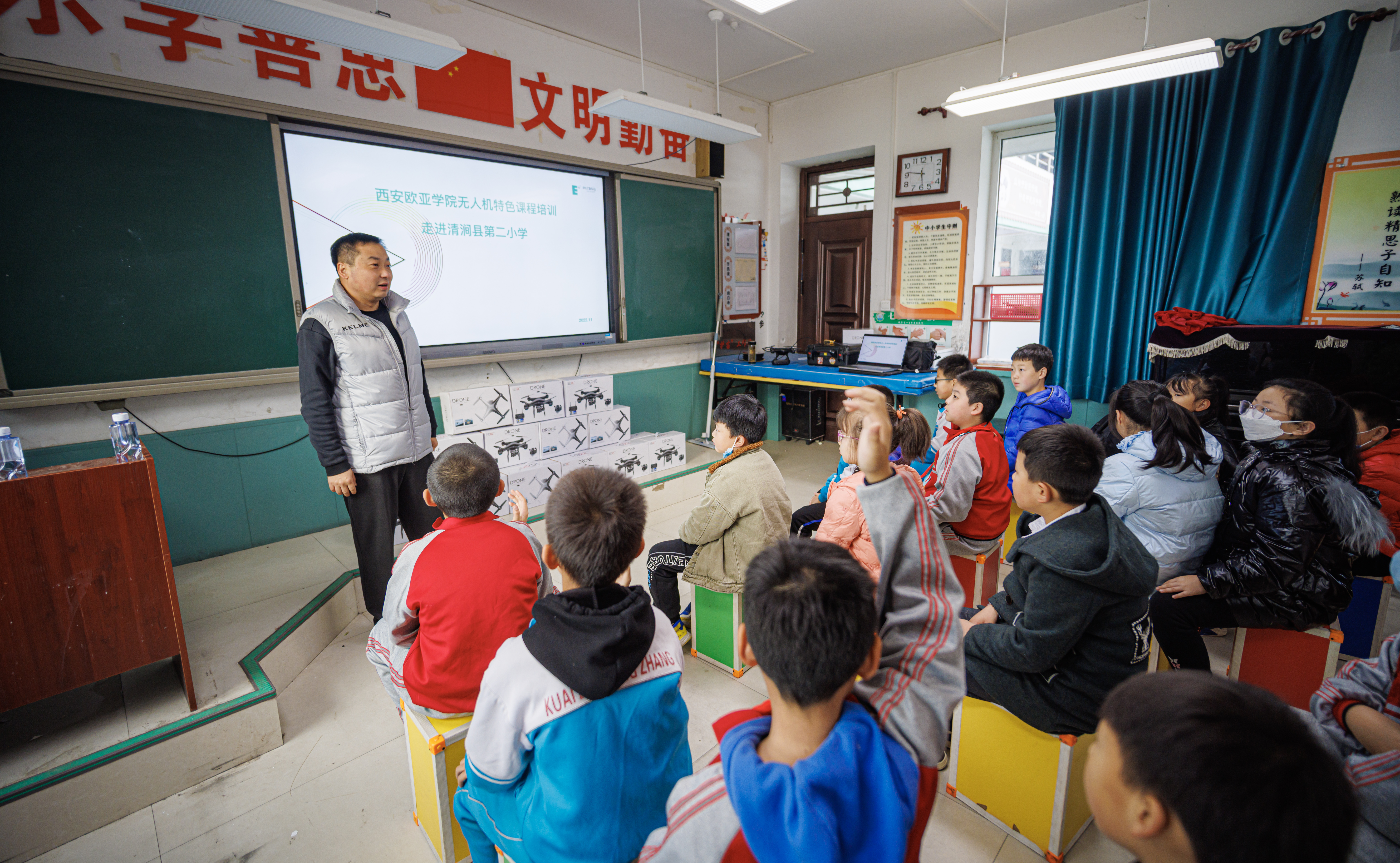 近年来,学校充分发挥学科教育资源优势,在清涧县启动了无人机拍摄与新媒体产学研基地“春苗计划”,每年为清涧县中小学开办一期无人机智能课程,以科技助力清涧县基础教育,提升清涧县中小学生无人机大赛竞赛能力,让他们在动手中激发创新,感受科技的无穷魅力。