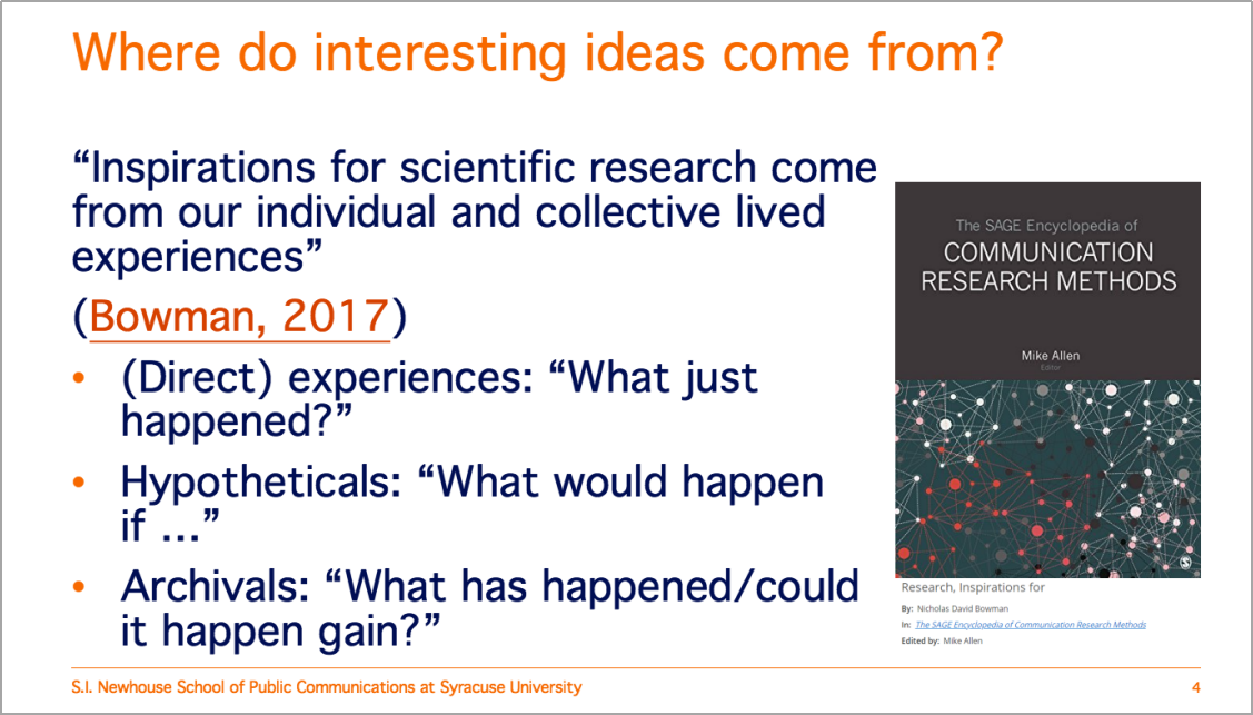 通常在做研究时,我们也许会从数据、知识结构或者知识理论入手,大多数人往往会忽略这些有趣想法的灵感来源,基于这样的思考框架,鲍曼教授从三个方向来思考有趣想法的来源。