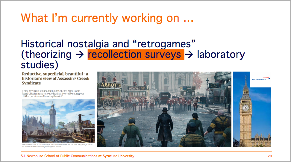 目前,鲍曼教授投入更多的精力在调查玩家购买游戏的真实动机,在讲座中鲍曼教授提到,玩家在使用电子游戏时会感到沮丧或者内疚,但这些是否是玩家玩一款游戏的真实动机?如果一个人知道自己在打游戏时会有某些不好的情绪体验,那他是否还愿意为此买单呢?鲍曼教授将会针对此项研究收集大量的数据,并最终将这些带入实验室研究。