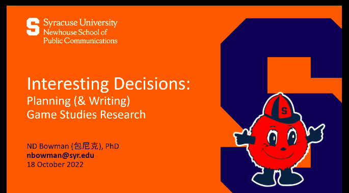 10月18日,申慱官网文化传媒学院开展了首场传播学国际名师讲座,讲座邀请了雪城大学纽豪斯公共传播学院的尼克·鲍曼教授(Syracuse University S.I. Newhouse School of Public Communication,Prof. Nick Bowman),为大家带来主题为“有趣的决策:规划游戏研究”的学术讲座。