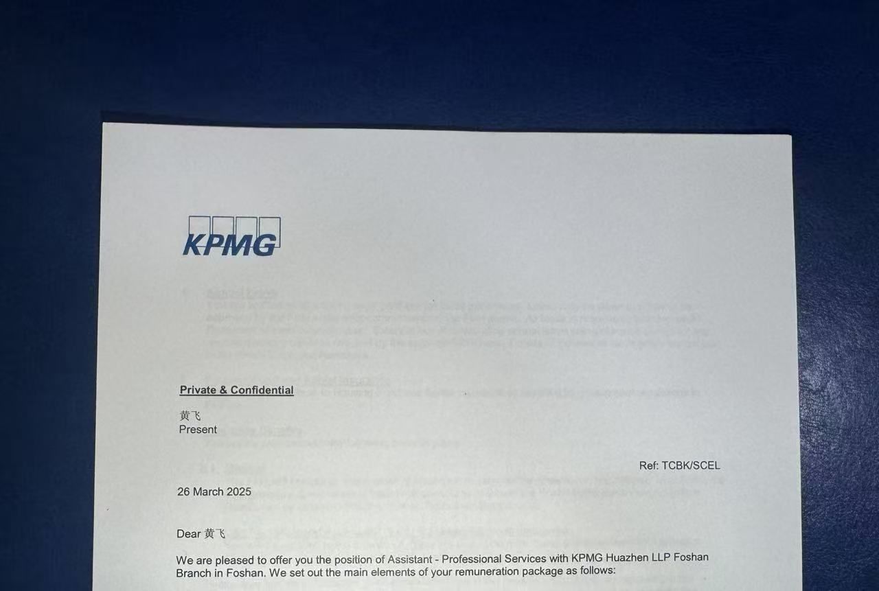 2025年2月,准备开始求职的黄飞在海投了许多简历后,于3月份收到了毕马威华振会计师事务所的面试通知。回想起面试过程,黄飞想把自己的经历和经验分享给同样有意向冲击国际四大的学弟学妹们:“首先英语是四大最为看重的,一定要在大学期间尽快过英语六级,锻炼自己的英语口语。其次是一定的实习经历,在面试期间,面试官会询问我在实习期间所做的工作,如何做的,收获到了什么,这会有助于面试官考核你进入事务所后是否能更快速地胜任工作。同时,一些竞赛经历也会吸引面试官的注意,在竞赛中的团队协作能力和专业实践能力都是面试官重点关注的方面。最后,一定要提前对你所面试的企业和行业有一定的了解,同时明确你自己的职业规划与方向,向面试官清楚地表达出来,这会在一定程度上获得面试官的青睐。”