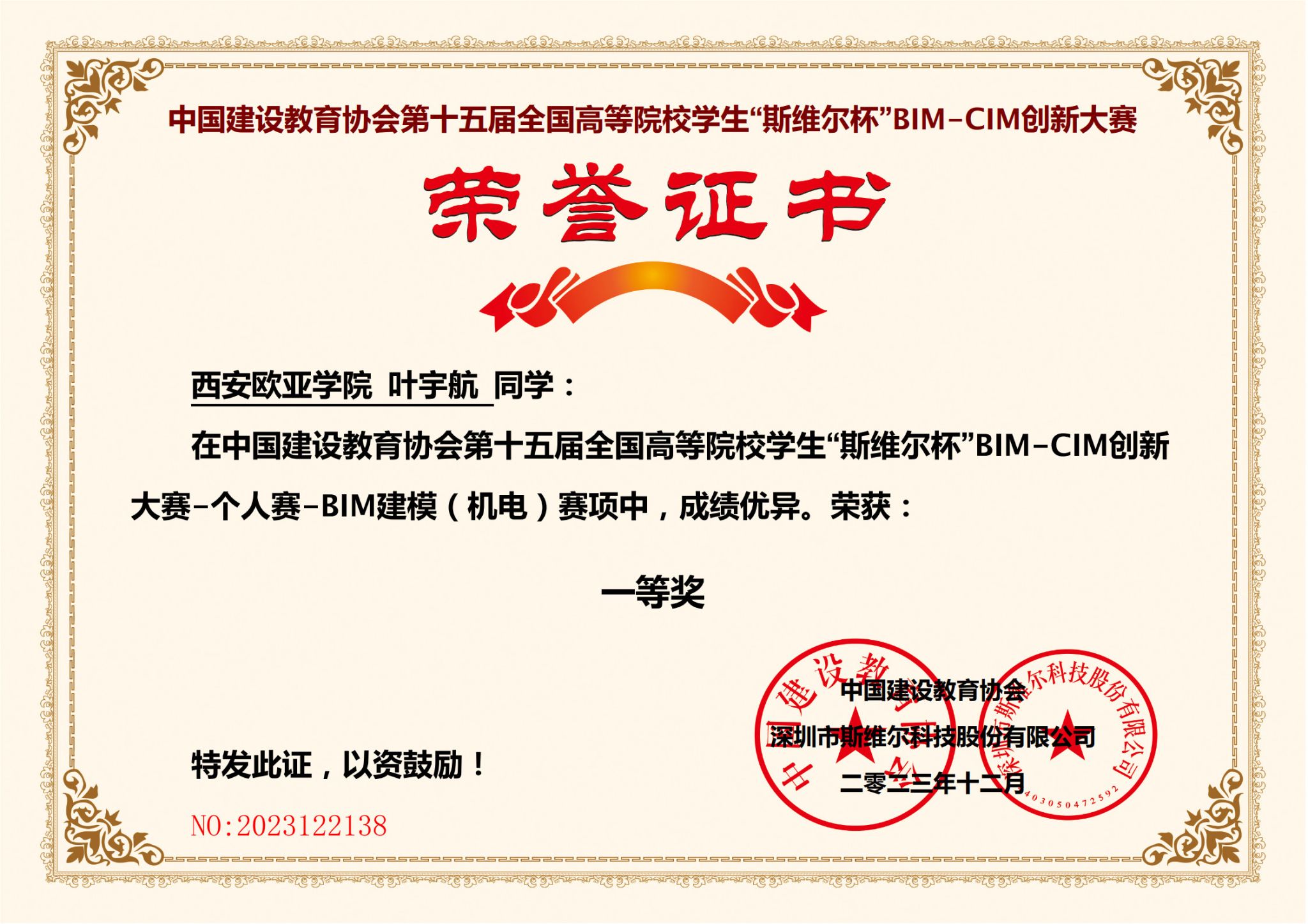 叶宇航获得的竞赛证书
