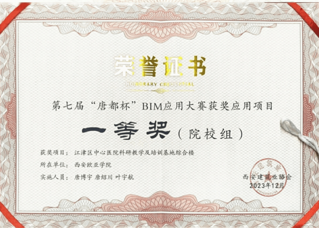 最终,他们从2000余名选手中夺魁,荣获第七届“唐都杯”BIM应用大赛一等奖。评委评价他们的作品达到了BIM精细度LOD400标准,堪称"竣工交付级"——建筑模型材质和色彩精准还原设计意图,结构模型清晰展示构件逻辑与加工信息,从设计参数到施工工艺的全维度信息一应俱全。当时,一等奖的奖杯还被老师郑重放在工作室证书展柜最高处,叶宇航说,“当时的心情就2个字,很爽!”
