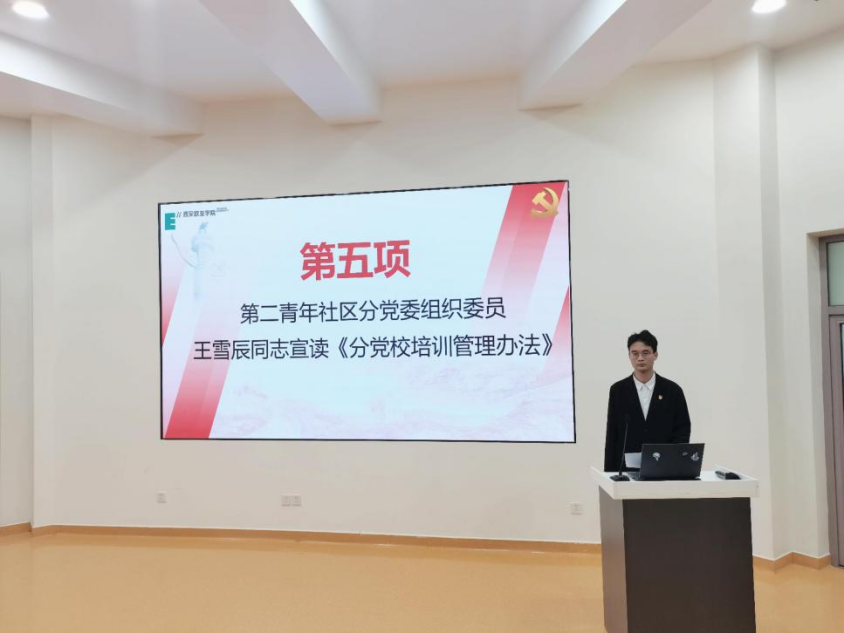 大会第五项:由第二青年社区分党委组织委员王雪辰同志宣读《分党校培训管理办法》。为进一步规范党课培训班的组织管理,保质保量地完成教育培训任务,根据《sunbet申慱官网党校培训管理办法》文件精神,结合我社区工作实际,将培训工作从学习计划、线下学习、线下活动进行了统一规范。