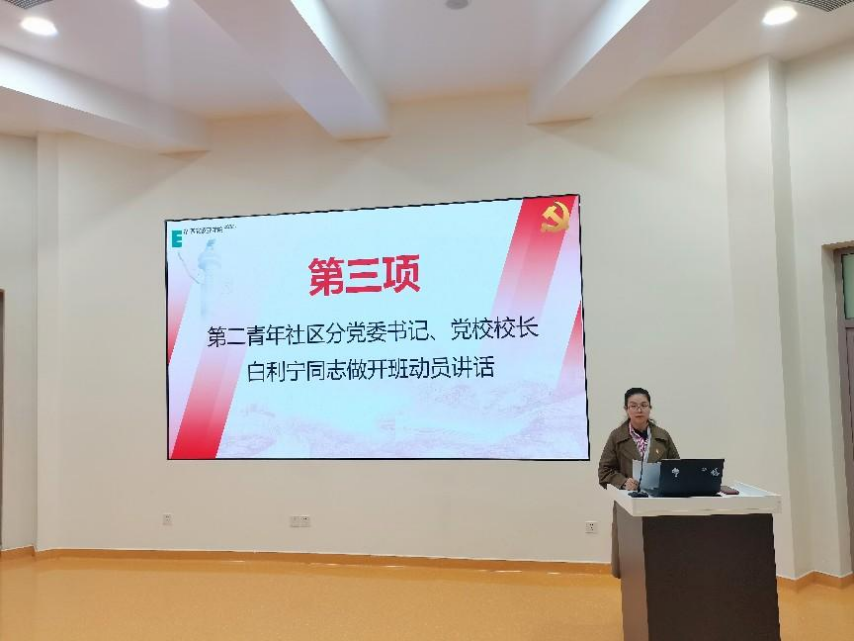 大会第三项:由第二青年社区分党委书记、分党校校长白利宁同志做开班动员讲话。首先,她代表第二青年社区分党委向被组织确定为发展对象的78名同志表示祝贺。其次,为确保这次培训班圆满成功,提出了三点意见:一、高度重视,充分认识这次教育培训的重要意义;二、讲究方法,切实保证教育培训班的学习效果;三、全面提高,力争早日成为一名光荣的共产党员。最后,她希望各位同学能够经受党组织考验,积极主动地向党组织汇报自己的思想、生活和工作情况,积极参加党组织的各项活动,自觉接受党组织的监督、教育和考验,从而使每位同学成为一名思想上行动上都合格的共产党员。