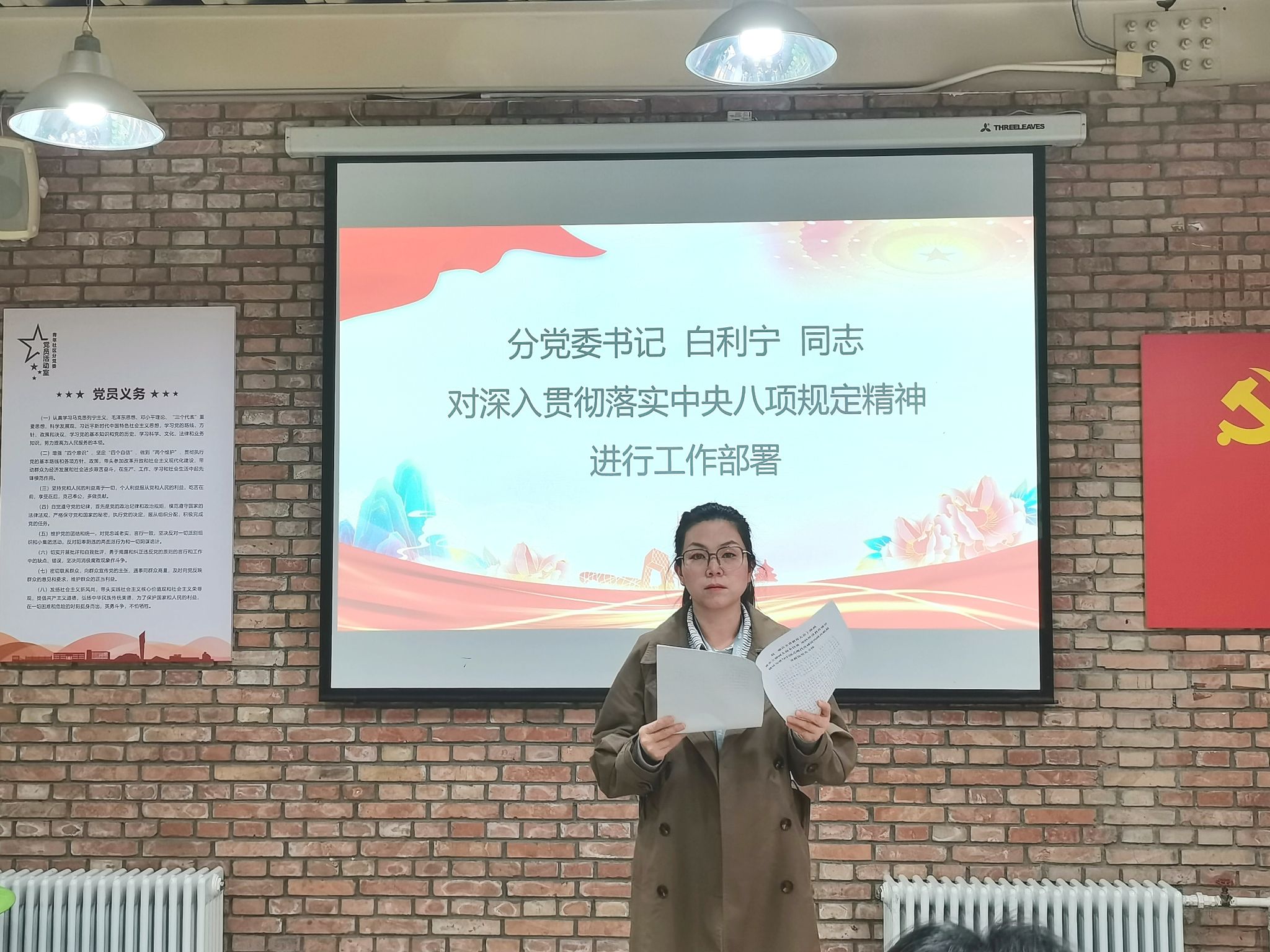 分党委书记白利宁同志对各学生党支部提出了明确要求:1.深化理论武装,筑牢思想根基。应结合“三会一课”、主题党日等方式开展中央八项规定精神学习教育专题会议;2.严抓作风建设,树立先锋形象。建立学生党员日常监督机制,对作风问题做到早发现、早提醒、早纠正,强化纪律意识;3.强化责任担当,推动工作落实。结合社区实际,组织学生党员参与“廉洁文化进社区”“学风建设月”等特色活动,在实践中锤炼党性修养,发挥先锋模范作用。