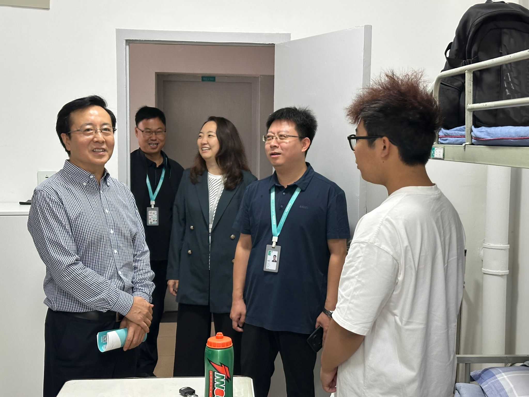 走访过程中,赵国华书记一行与同学们亲切交流,详细询问住宿环境、饮食情况及入学适应状态。并仔细查看宿舍设施,向学生们强调要规范使用电器设备,注意宿舍用电、用水安全,防范潜在风险。赵国华书记关心学生日常生活是否便利,并叮嘱大家互相关心、互相帮助,共同营造整洁、健康、友善、自律的宿舍环境。若在生活或学习上遇到问题,及时向辅导员和学校反映,学校将全力解决后顾之忧。面对校领导的关心,新生们纷纷敞开心扉,分享入学以来的新鲜体验,言语间满是对大学生活的期待与憧憬。家长们也表示对学校及宿舍的环境设施的肯定,希望学生可以在这里学习知识、拓展综合素质,在校园中找准方向,成长为有理想、有本领、有担当的新时代青年。
