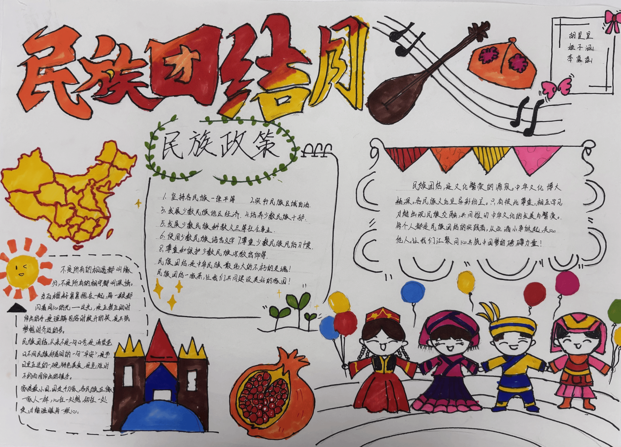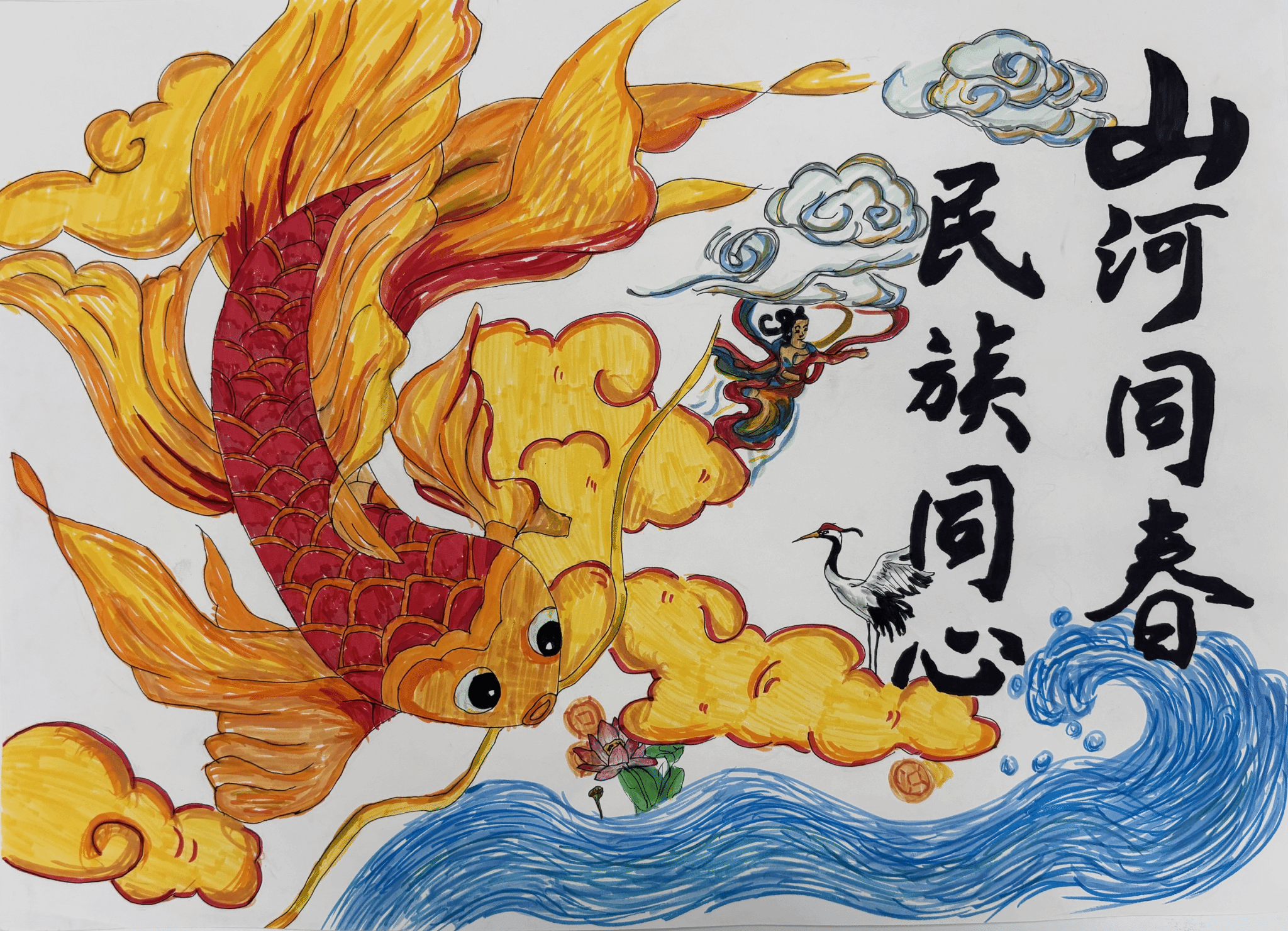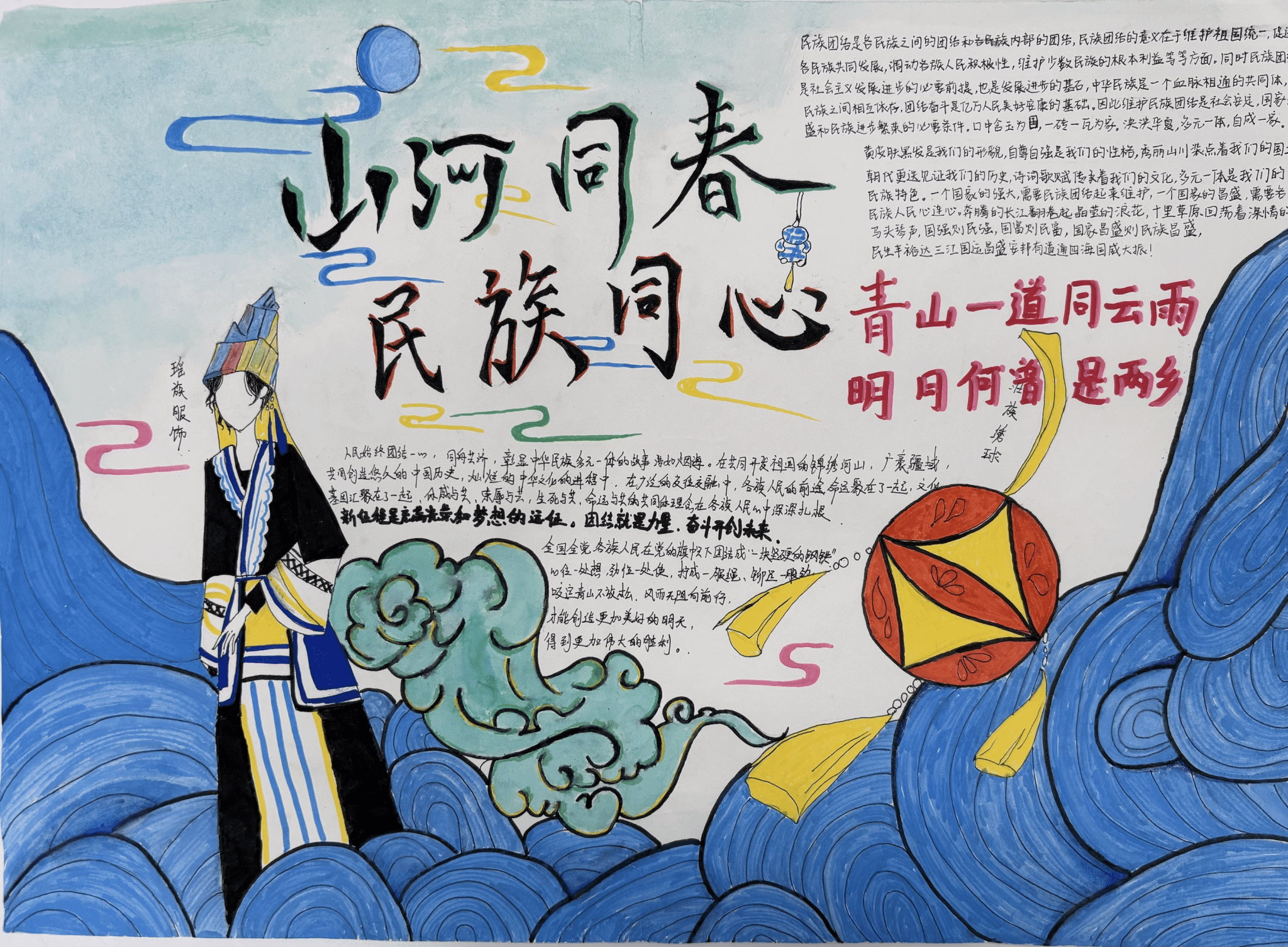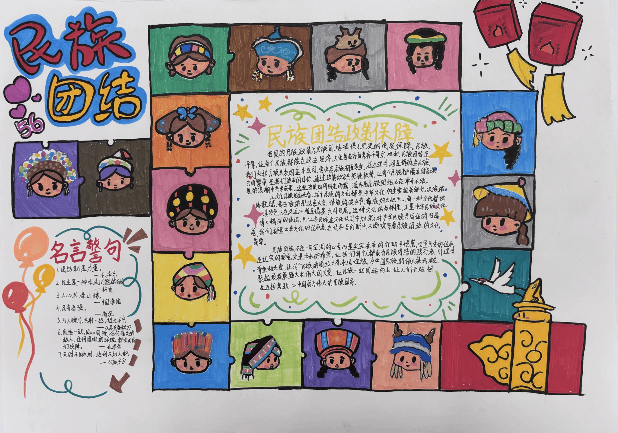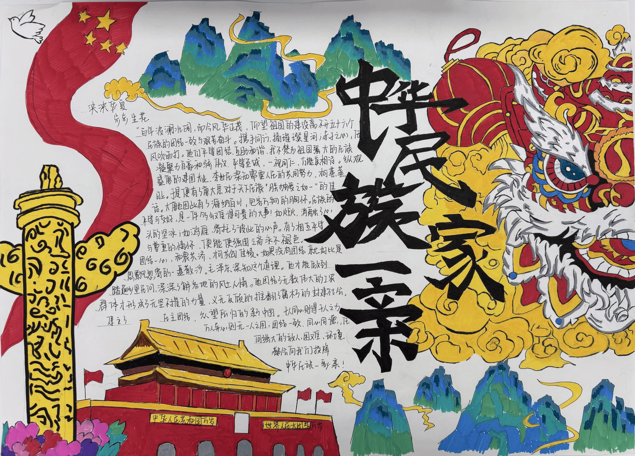 这些作品主题鲜明,内容充实,设计新颖。同学们围绕民族团结、中华优秀传统文化、祖国壮丽河山等核心元素,巧妙构思,精心创作。一幅幅作品或色彩绚丽,展现各民族服饰与歌舞的魅力;或笔墨含情,讲述各民族守望相助的动人故事;或版面精美,勾勒出各族人民共同繁荣发展的美好图景。经过认真评审,共有14份作品因立意深刻、设计出色、书写工整而脱颖而出,被评为优秀作品。下列是部分优秀作品展出: